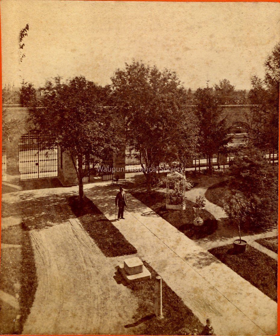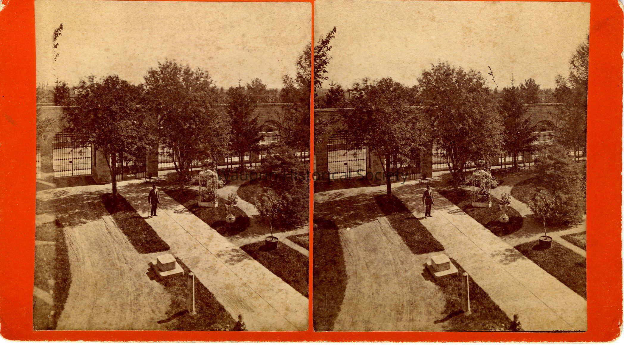 Stereo view of the front of the prison. Shows a man with a cane coming into the building. Notice the landscaping between the building and the fence. There is a road, turn around and a stone step to aid people when they get out of a carriage. The vertical post is probably to tie horses. The Waupun Heritage museum has one of the planters shown on the right of the walk. This area is presently a building addition. On the back is written in ink: State Prison View (?) Waupun Wis. Oct. 29, 1877. The name of the company that made the Stereo view is also indicated: S. M. Taylor, Berlin, Wisconsin.Acquisition