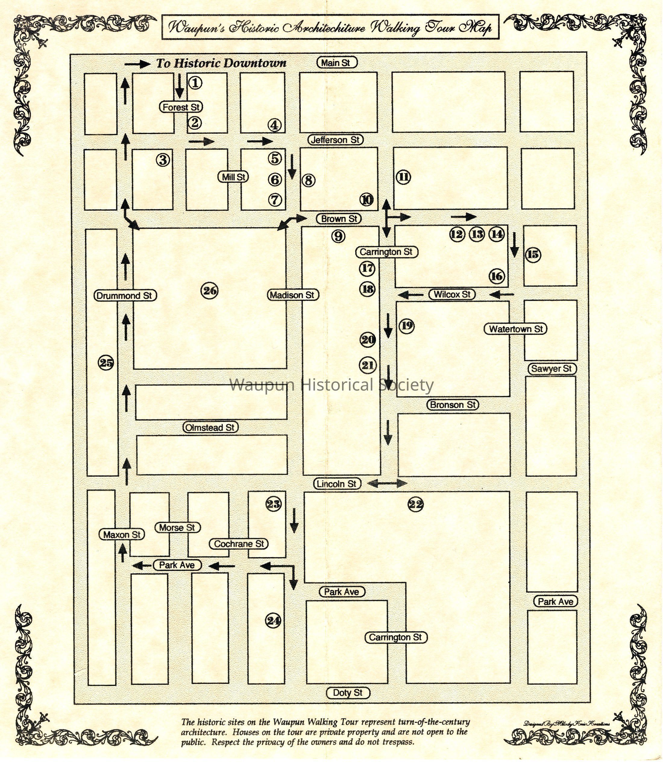 Historic Walking tour of Waupun. Brochure advertising a Historic Architecture Walking Tour of Waupun, WI. Published by Waupun Chamber of Commerce. Brochure isn't dated. Contains a map showing streets, historic sites and the walking tour.