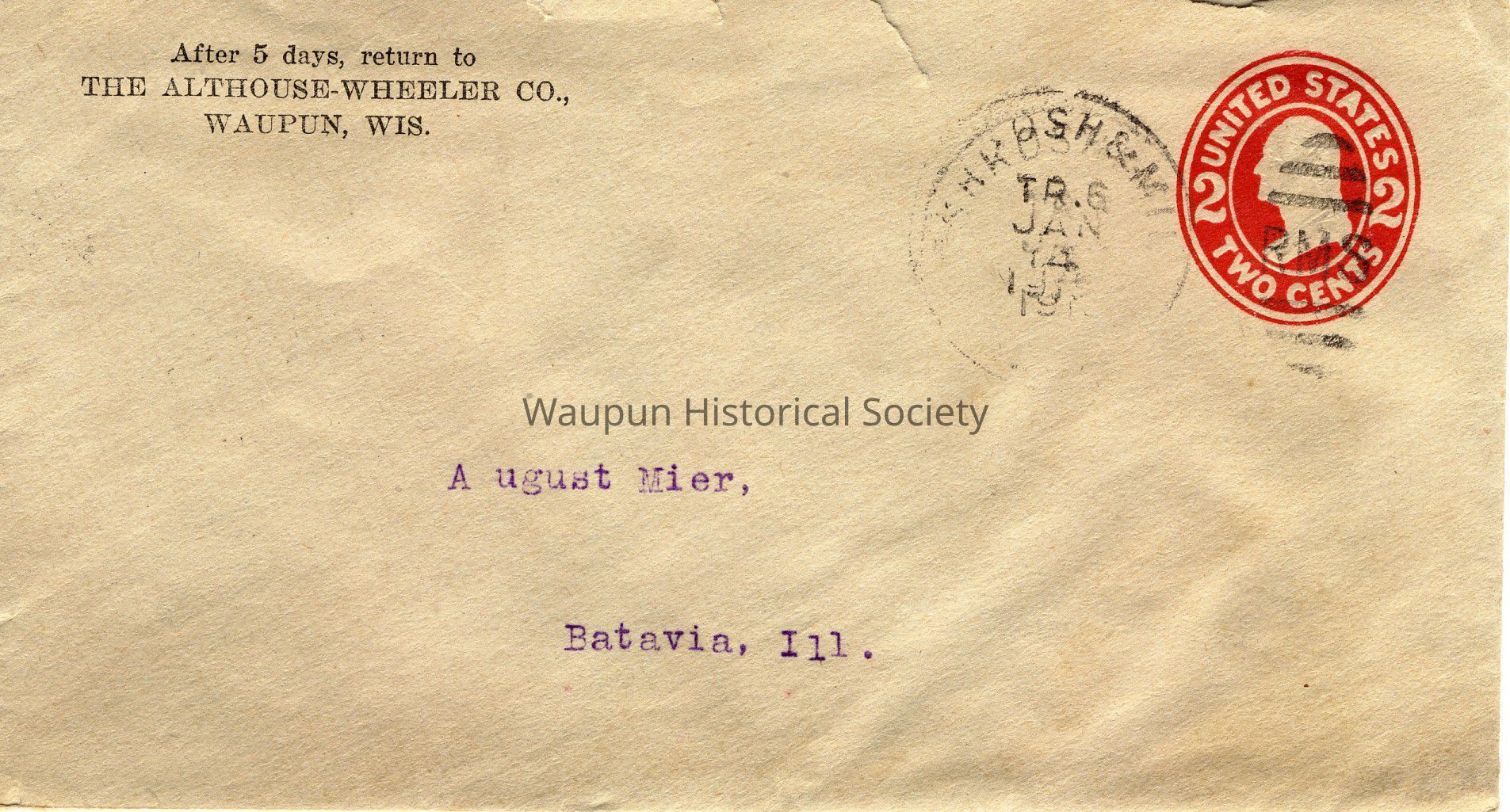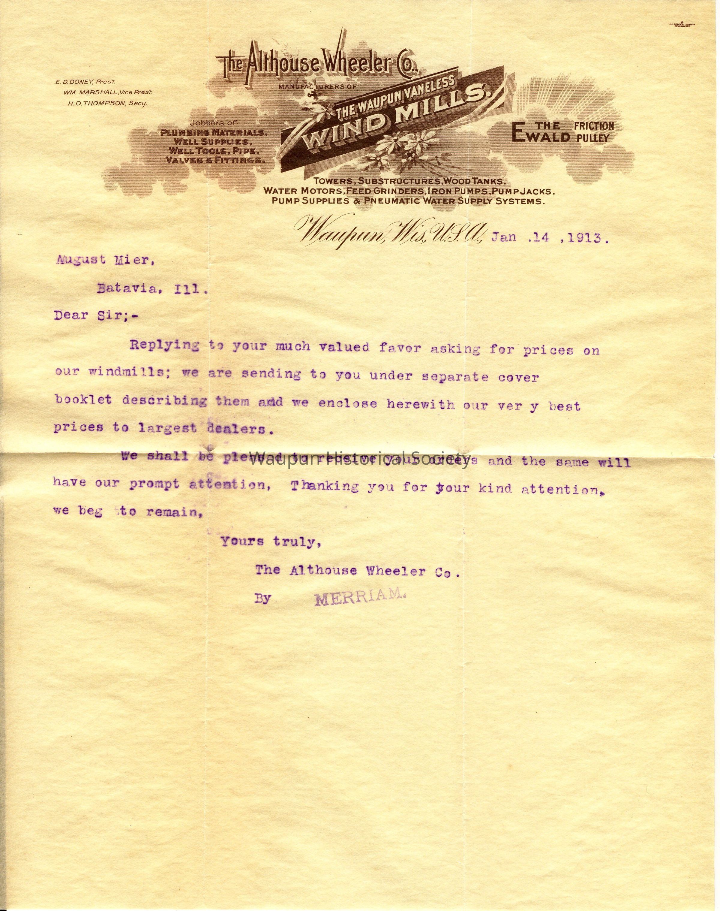 Letter, Althouse Wheeler Co. Letter, Sent January 14, 1913 to August MierEntry/Object ID