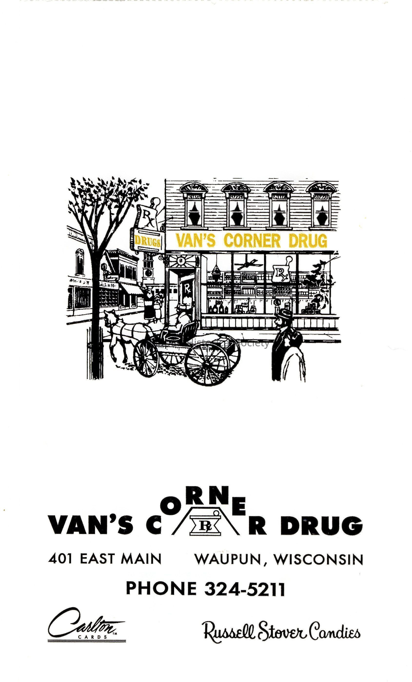 Advertising bag from Van's Corner Drug. This is the 5" X 10 1/4 " size. Van's Corner Drug was on the Southeast corner of Main and Madison. It went out of business in the fall of 2008 when the new Walgreen's Drug Store opened.Acquisition