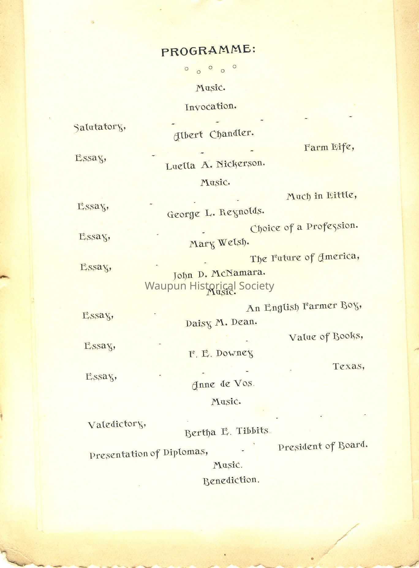 THE TENTH ANNUAL COMMENCEMENT OF THE SOUTHWARD HIGH SCHOOL OPERA HALL, WAUPUN, Thursday Eve'g, June 22, 1893.