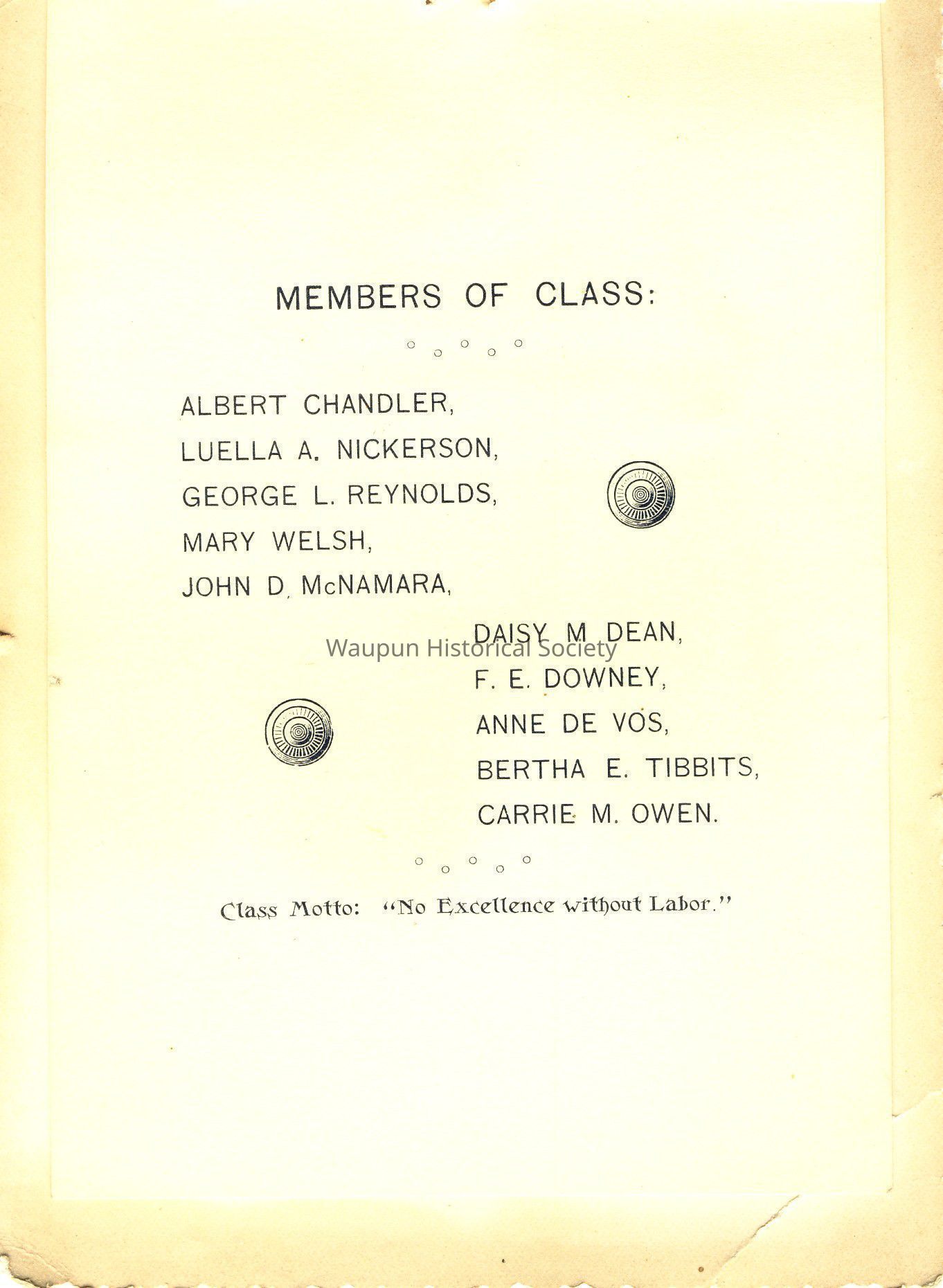 ALBERT CHANDLER, LUELLA A. NICKERSON, GEORGE L. REYNOLDS, MARY WELSH, JOHN D, McNAMARA, DAISY M. DEAN, F. E. DOWNEY, ANNE DE VOS, BERTHA E. TIBBITS, CARRIE M. OWEN.