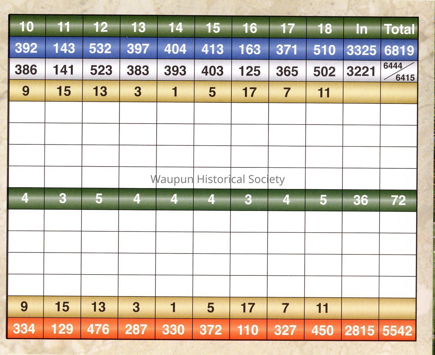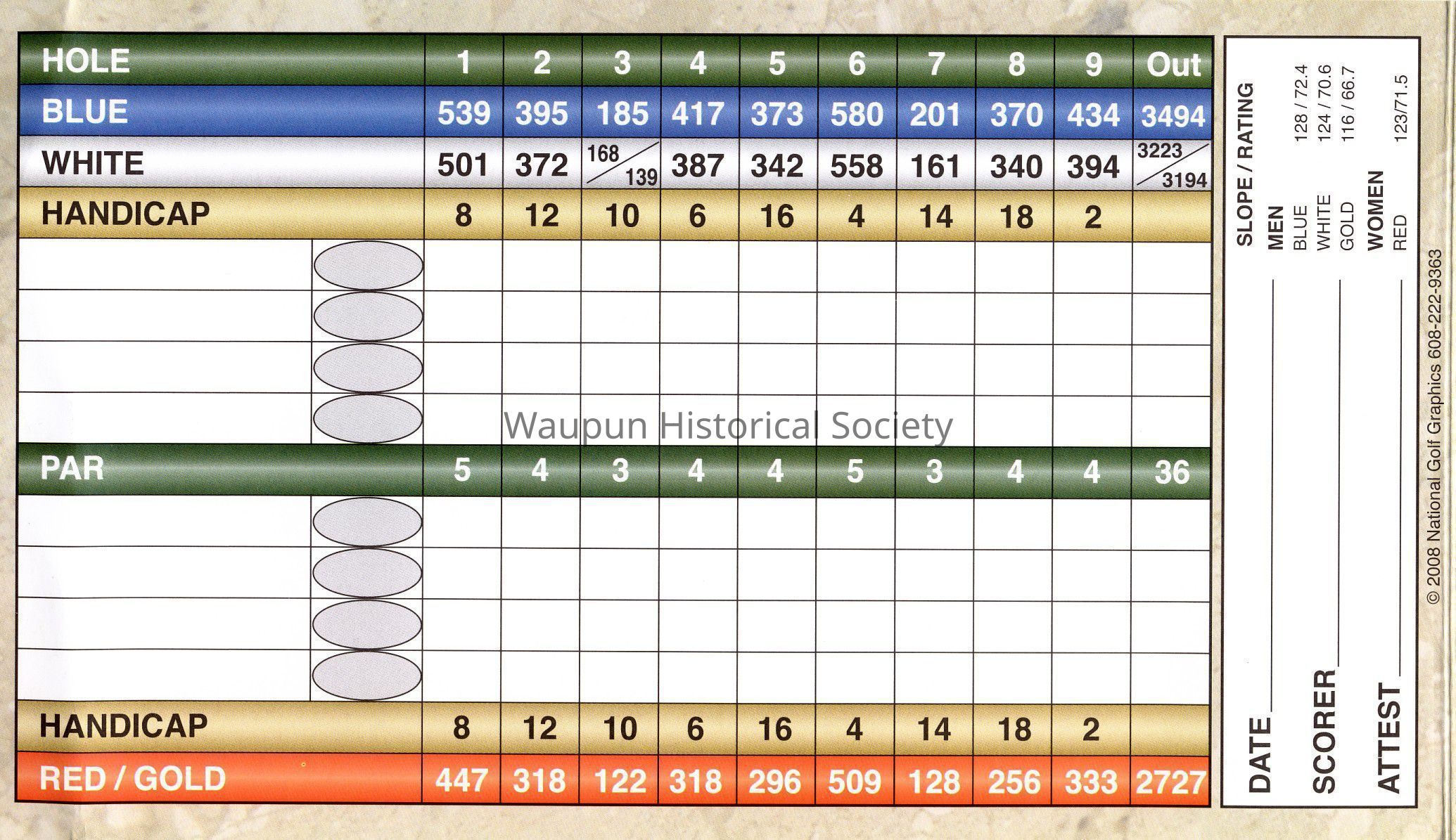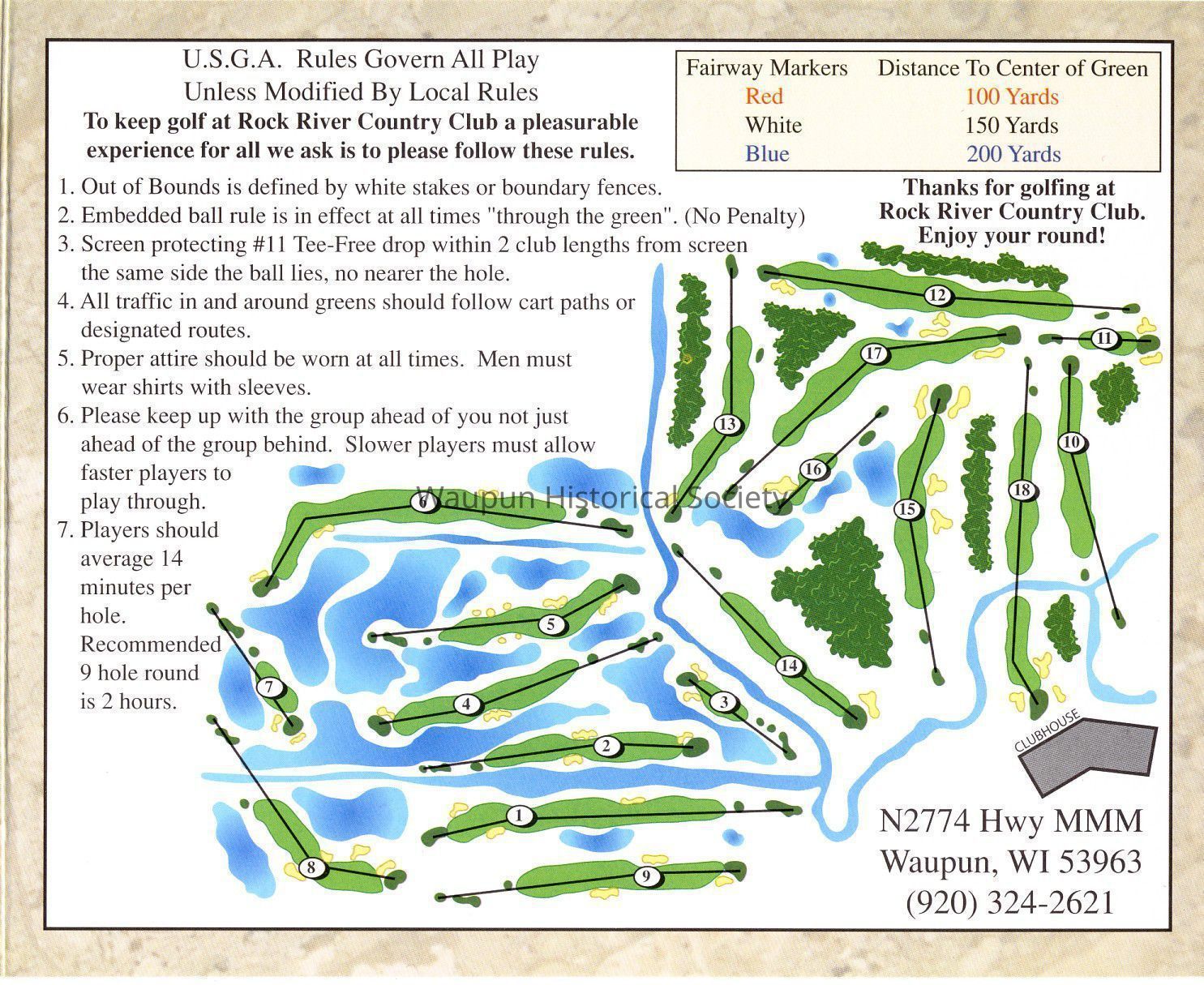 Scorecard from the Rock River Country Club. Picked up by Jim Laird at the 2009 Home Show in Waupun. Has a great picture of the Country Club from the course side, score spaces for the first 9 holes, score spaces for holes from 10 to 18, and rules. There is also a space for the players name and the person who attests the results.