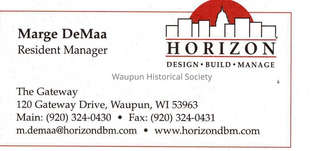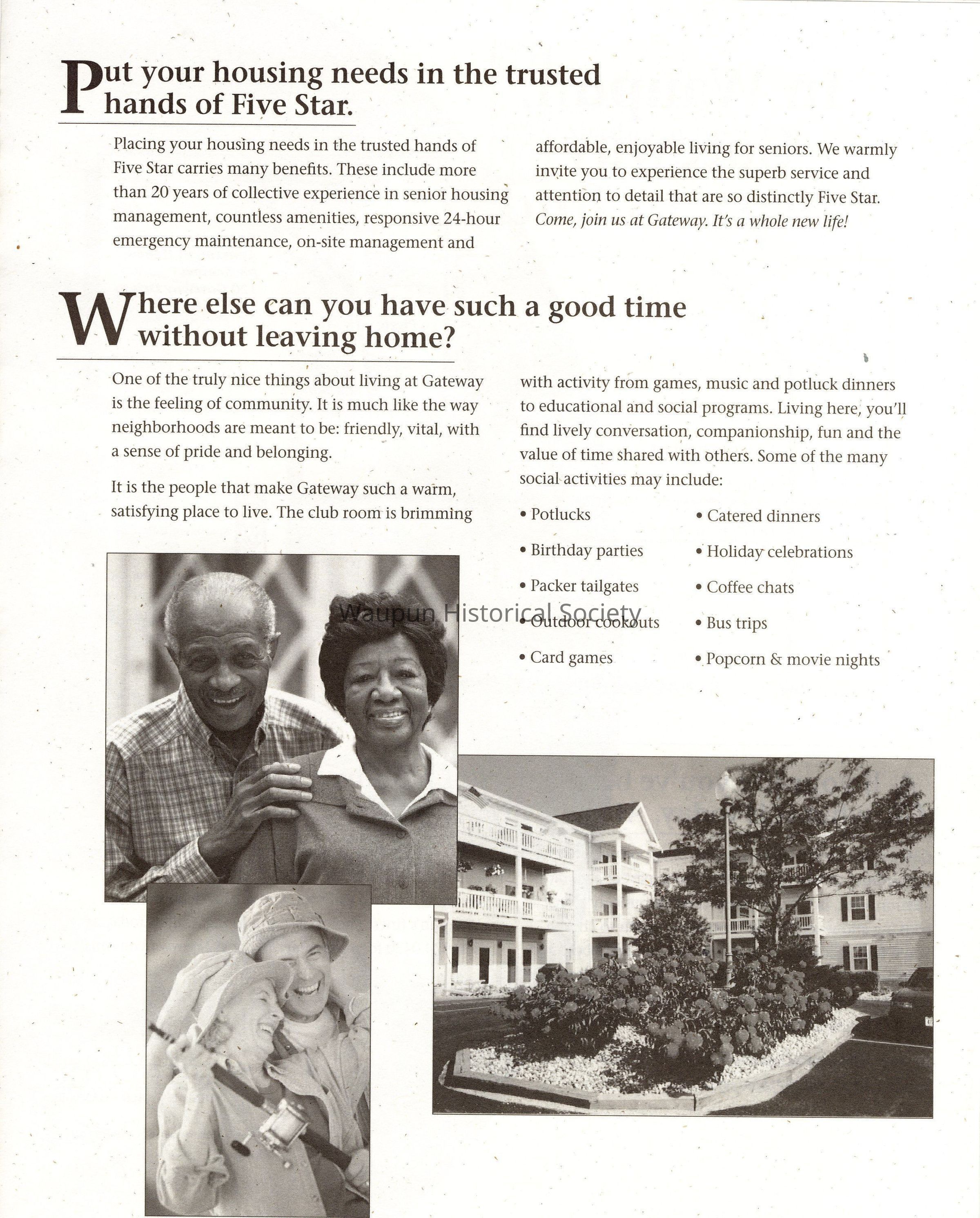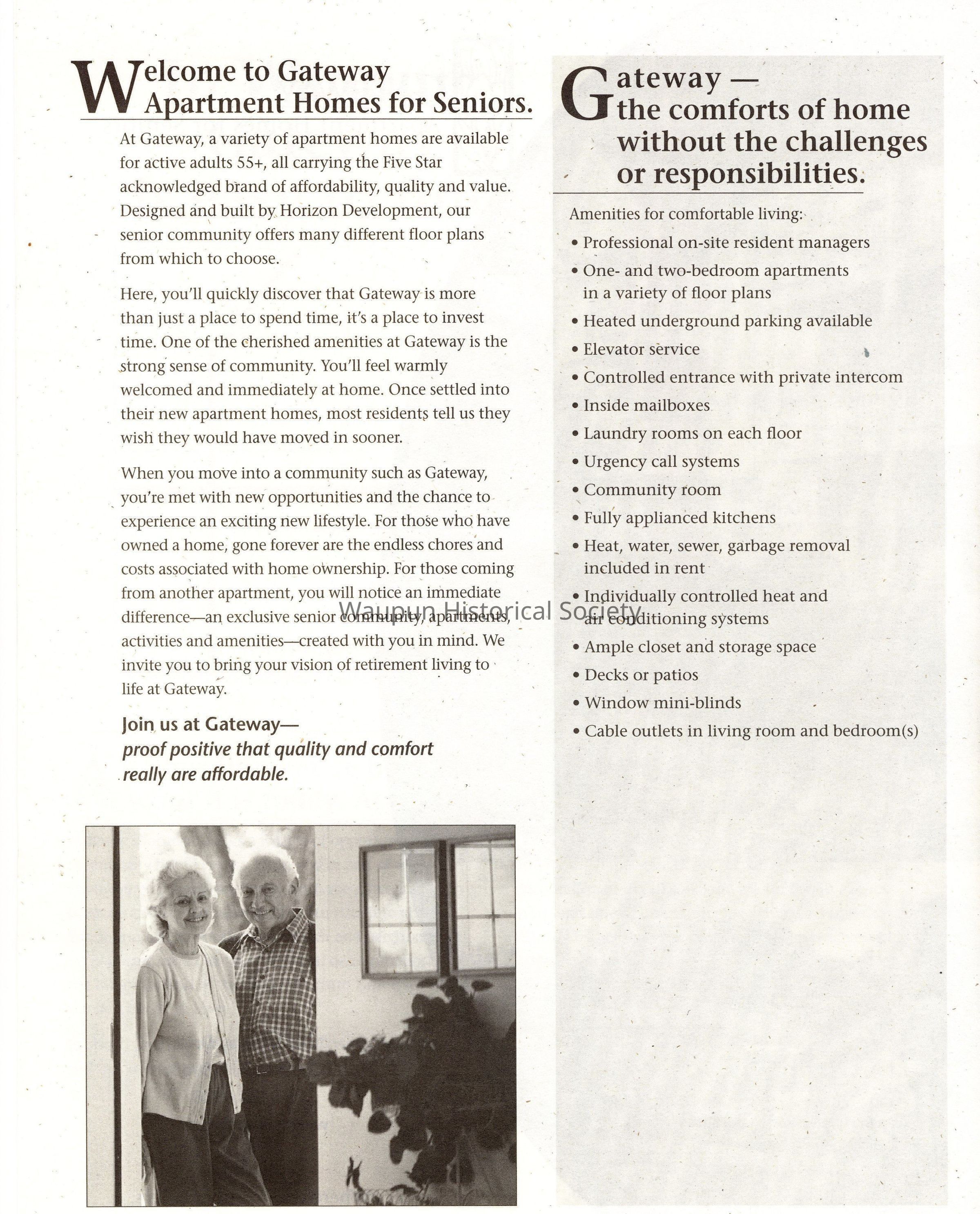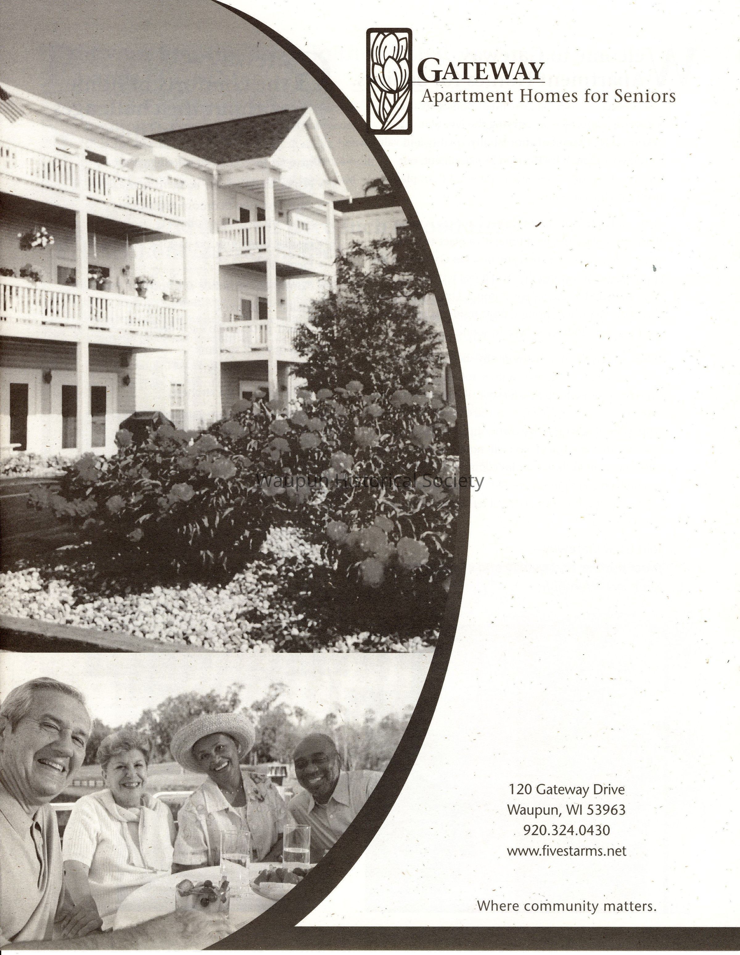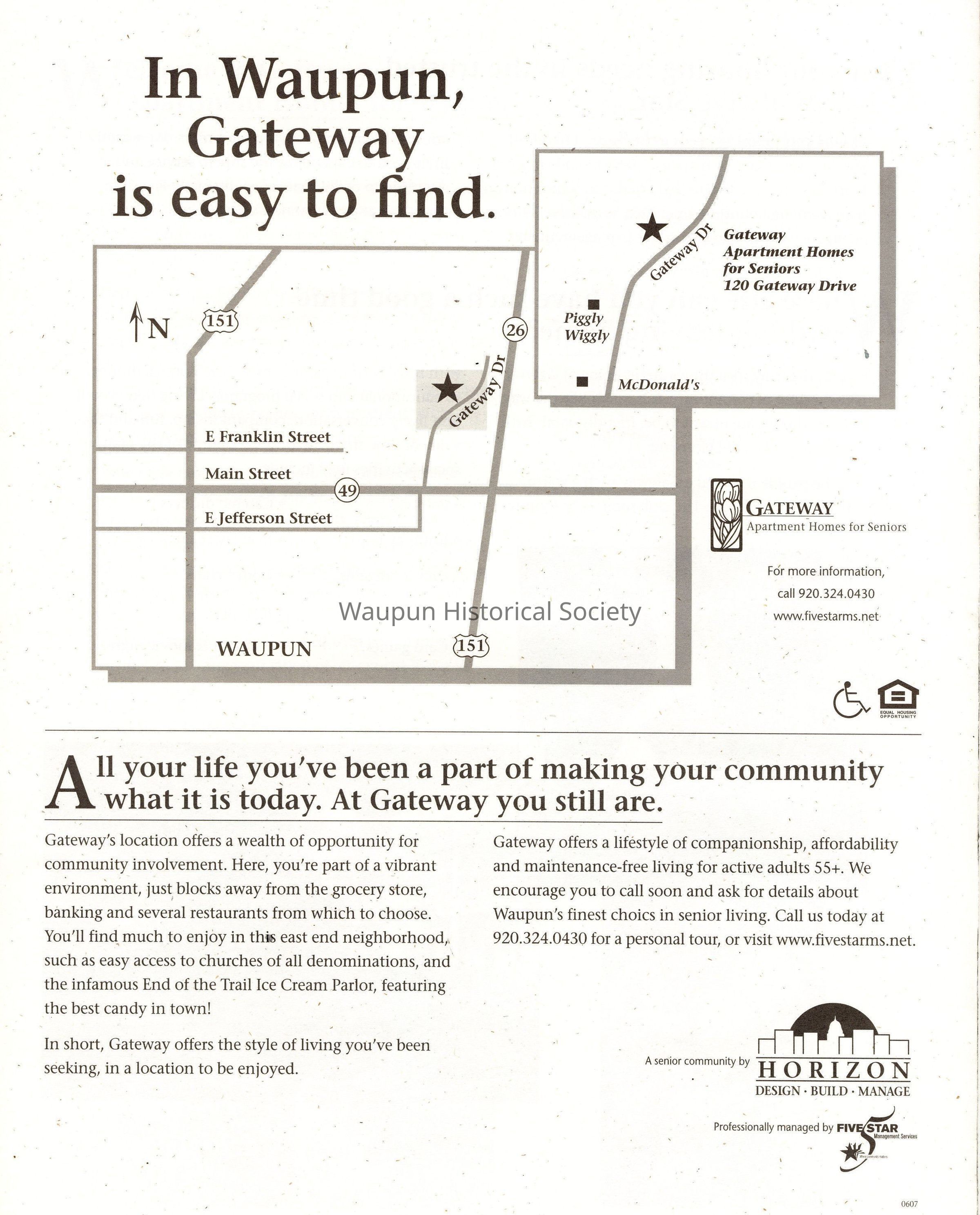 Advertisement for Gateway Apartments in Waupun. Jim Laird picked up at 2009 Home Show.
