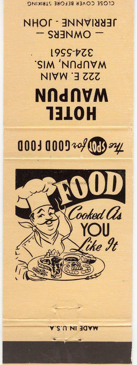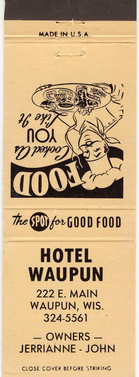 Match Book Cover for the Hotel Waupun. The phone number 324-5561 indicates that the match book was given out after 1961. The 1970 city directory lists Hotel Waupun, John Vanderkin ptnr, 222 E Main, 5561. Jerrianne is listed as his wife. They operated the Hotel until it was torn down to make a parking lot for the National Bank. They then moved accross the street and opened Jon-E-Vans. The 1976 city directory lists Jon-E-Vans - John Vanderkin owner - restaurant, cocktail lounge, meeting rooms and banquet facilities. 300 East Main Street - 324-5561Acquisition