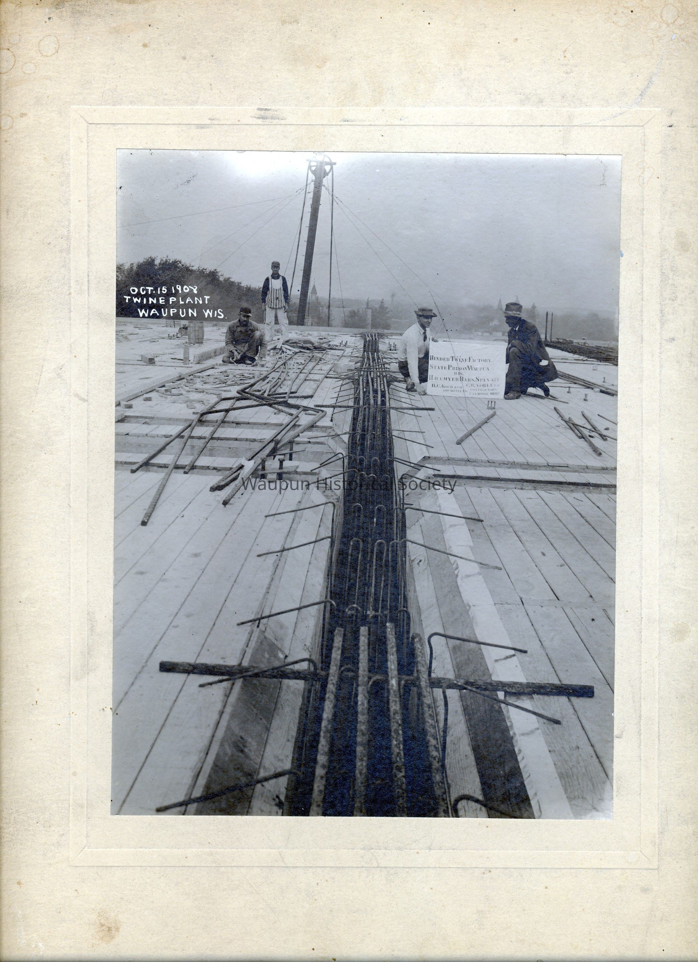 Photo of the construction of the Twine Plant at the Wisconsin State Prison, Waupun. The photo is dated October 15, 1908. At the right are two men holding a sign that indicates: Binder Twine Plant, State Prison, Waupun, WIS. Underneath is indicated the architects name but it can't be read. The photo was purchased on eBay by Jim Laird.Acquisition