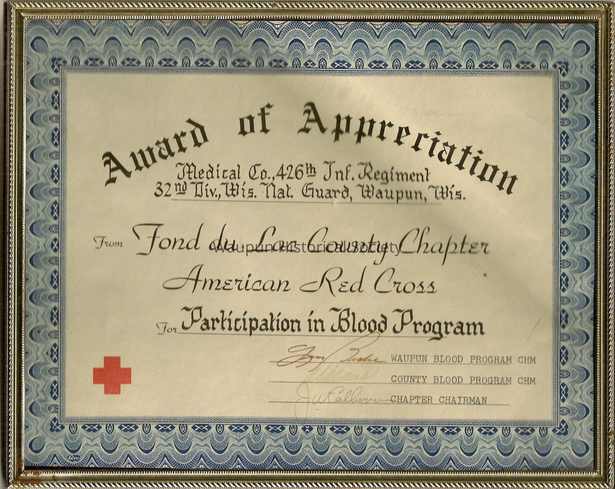 Medical Co. 426th Inf Regiment, 32nd Division., Wisconsin National Guard, Waupun, WI. Given by the Fond du Lac Chapter of the American Red Cross, for paricipation in the Blood Program.
