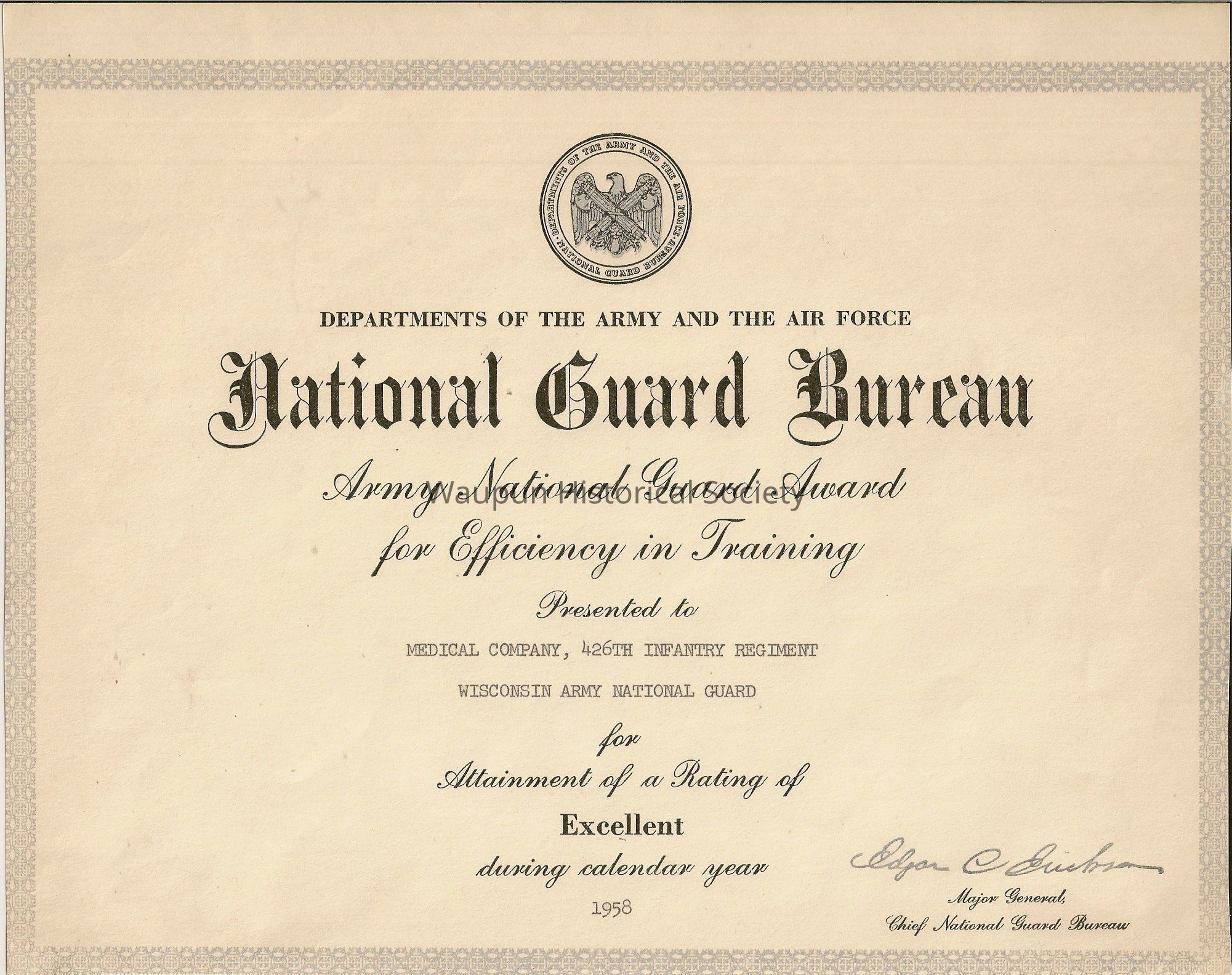 Wisconsin National Guard for Attainment of a Rating of Excellent during the calendar year of 1958. Issued by Edgar C. Erickson, Major General, Chief National Gaurd Bureau.
