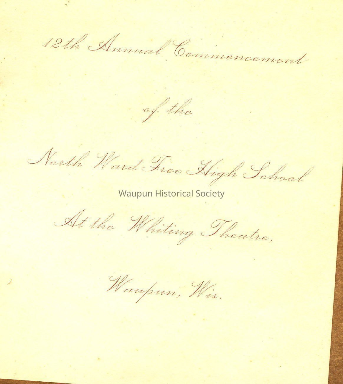 12th Annual Commencement of the North Ward Free High School At the Whiting Theater, Waupun, Wis., 1896.