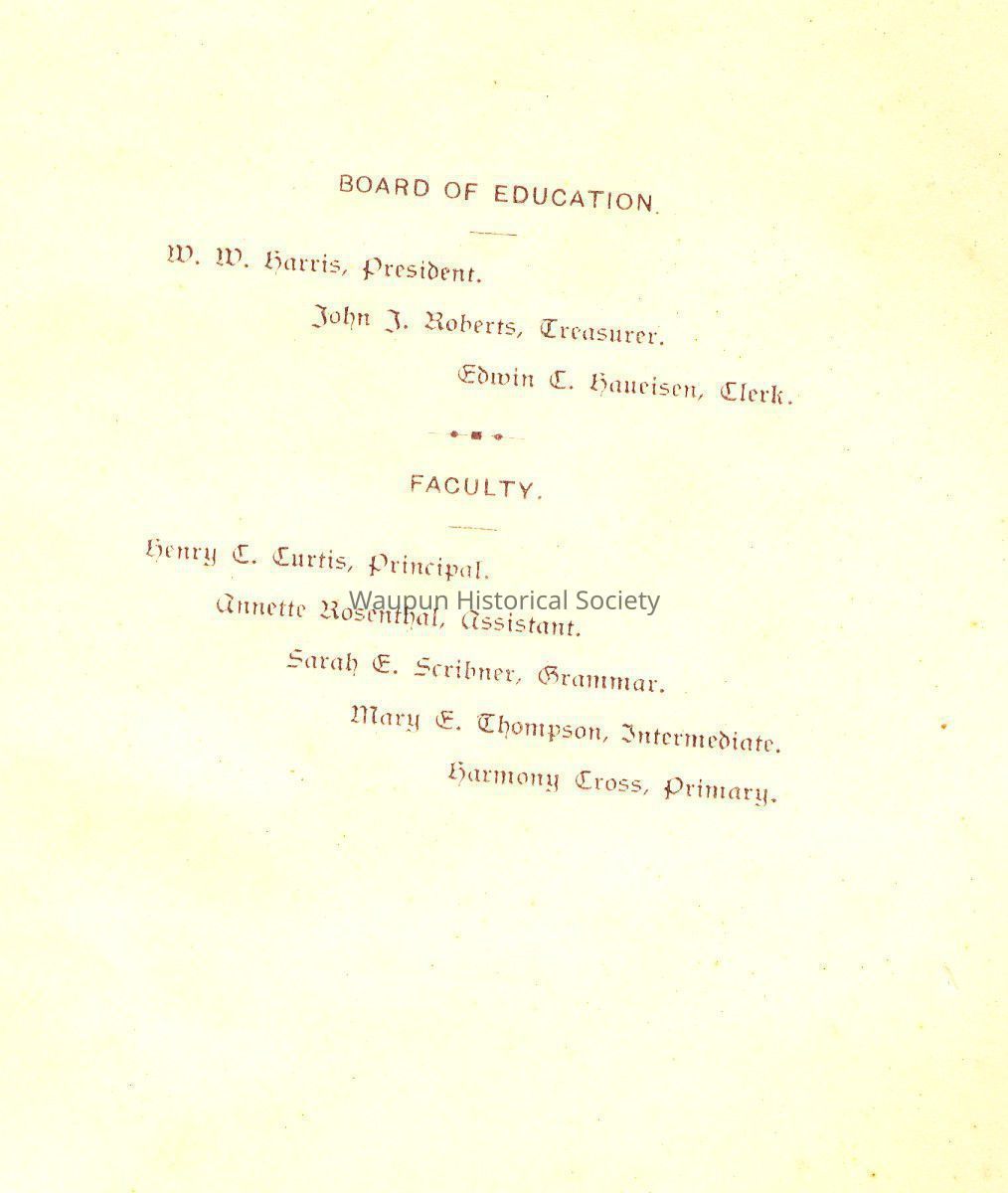 Faculty - Henry C. Curtis, Principal; Annette Rosenthal, Assistant; Sarah E. Scribner, Grammar; Mary E. Thompson, Intermediate; Harmony Cross, Primary.Acquisition