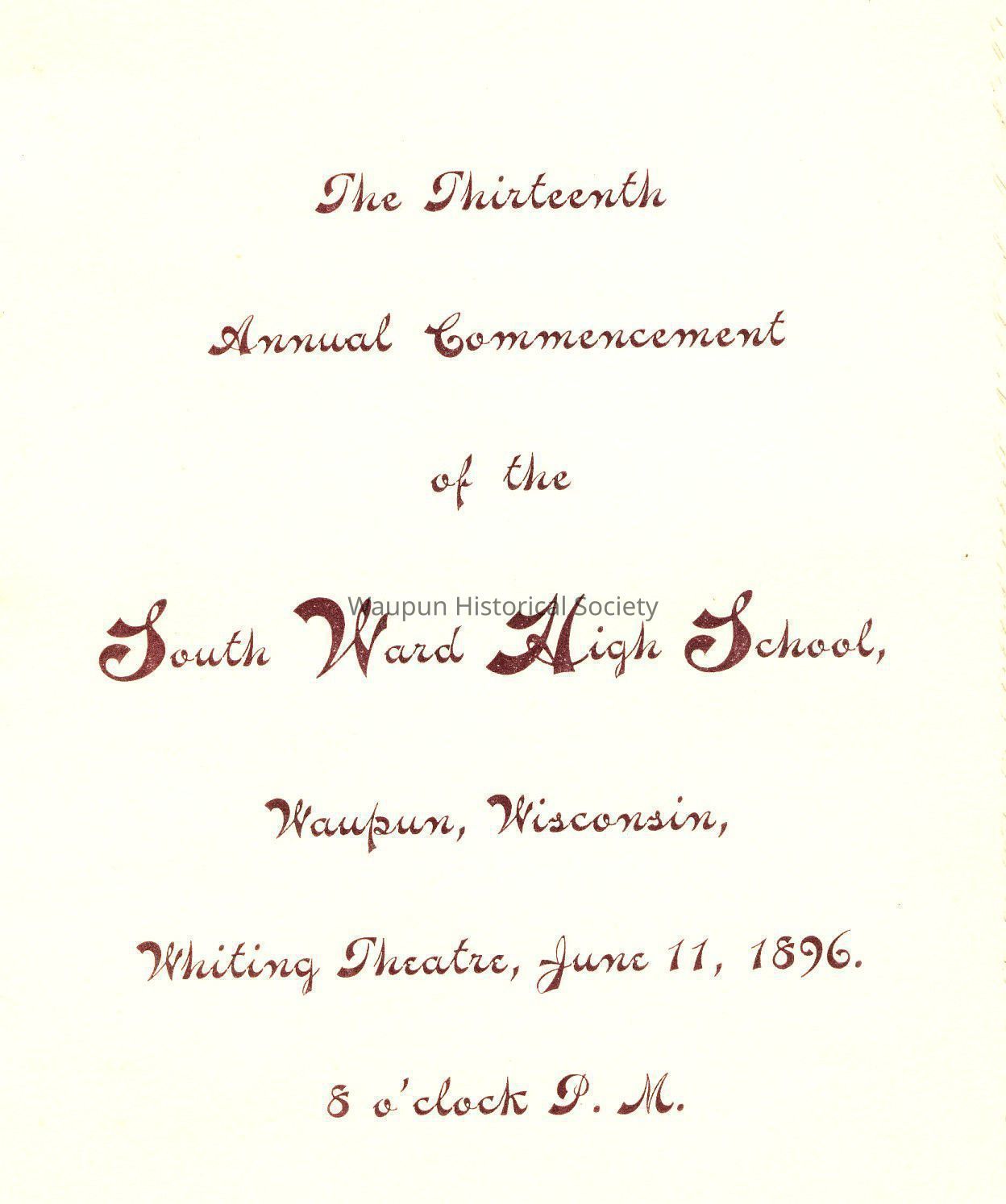 The Thirteenth Annual Commencement of the South Ward High School, Waupun, Wisconsin, at Whiting Theater, June 11, 1896, at 8 o'clock P.M.