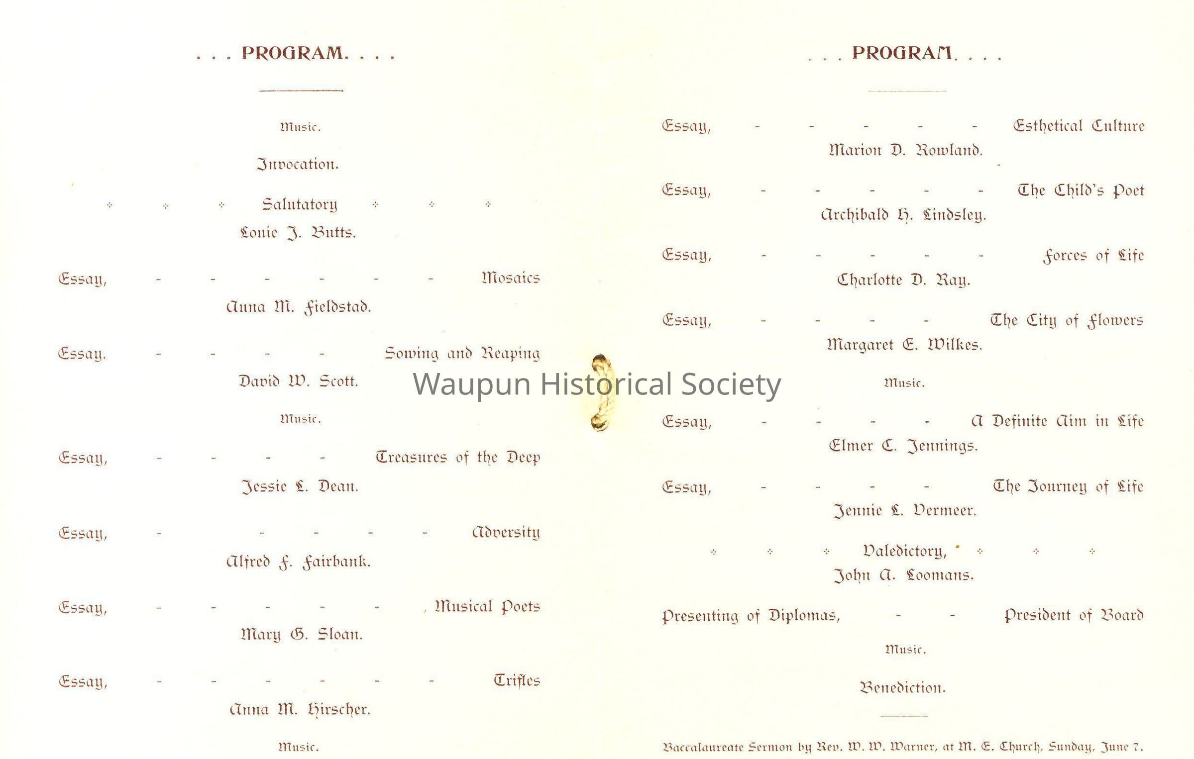 Baccalaureate Sermon by Rev. W. W. Warner, at M. E. Church, Sunday June 7, 1896.