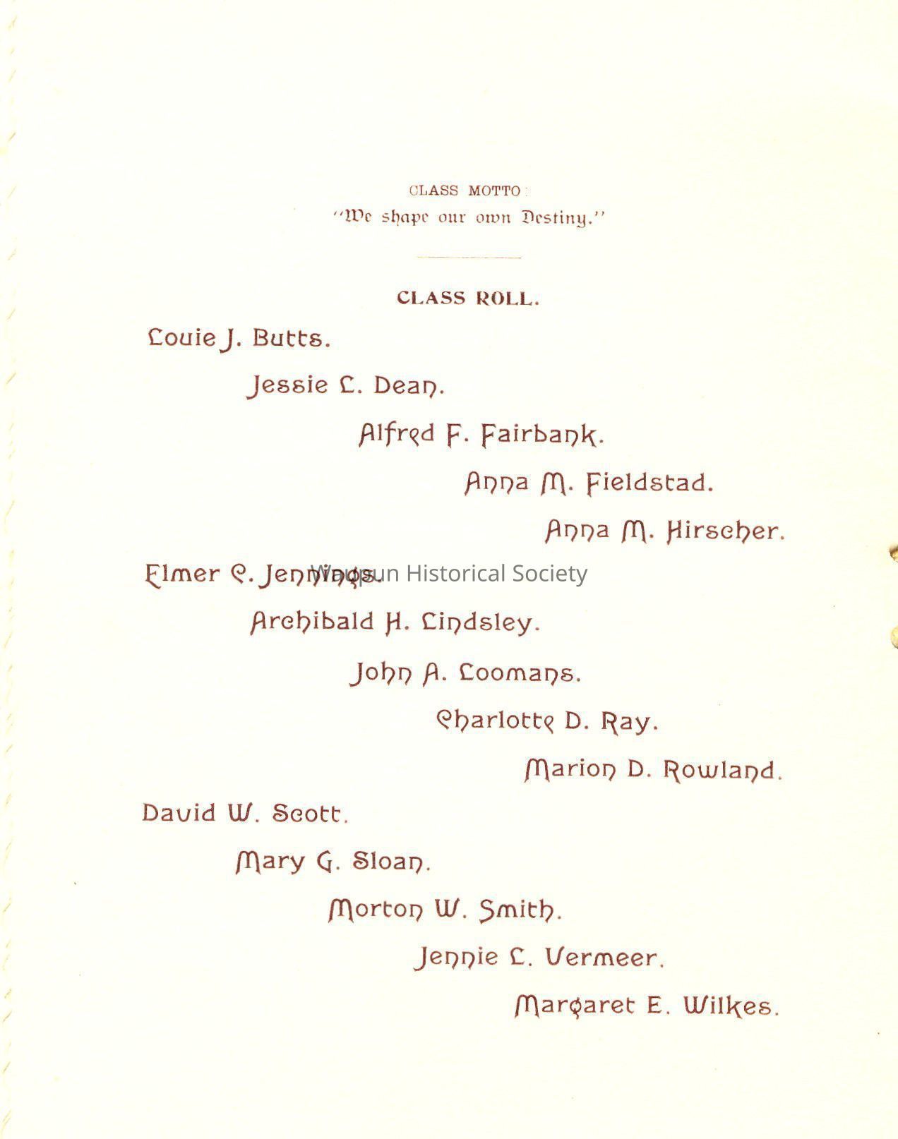 CLASS ROLL: Louie J. Burtts, Jessie L. Dean, Alfred F. Fairbank, Anna M. Hirscher, Anna M. Fieldstad, Elmer C. Jennings, Archibald H. Lindsley, John A. Loomans, Charlotte D. Ray, Marion D. Rowland, David W. Scott, Mary G. Sloan, Morton W. Smith, Jennie L. Vermeer, Margaret E. Wilkes.Acquisition