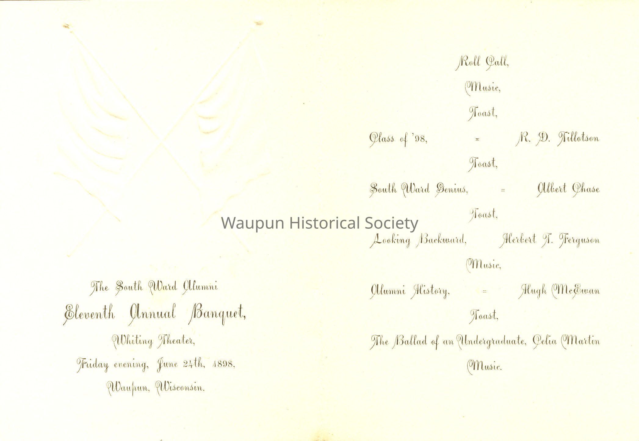 The South Ward Alumni Eleventh Annual Banquet, Whiting Theater, Friday evening, June 24th, 1898, Waupun, Wisconsin.