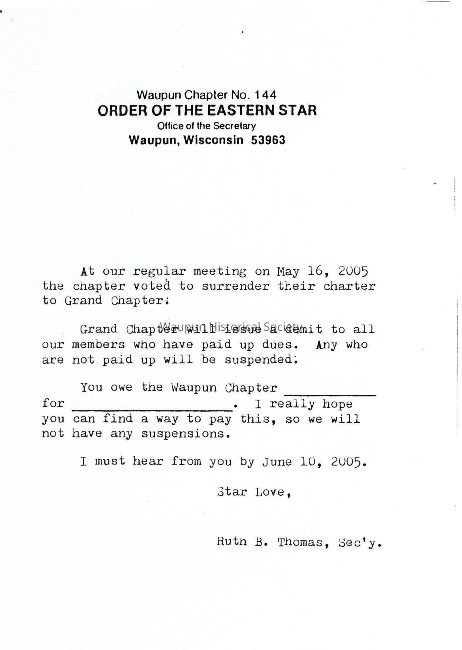 At our regular meeting on May 16, 2005 the chapter voted to surrender their charter to Grand Chapter.