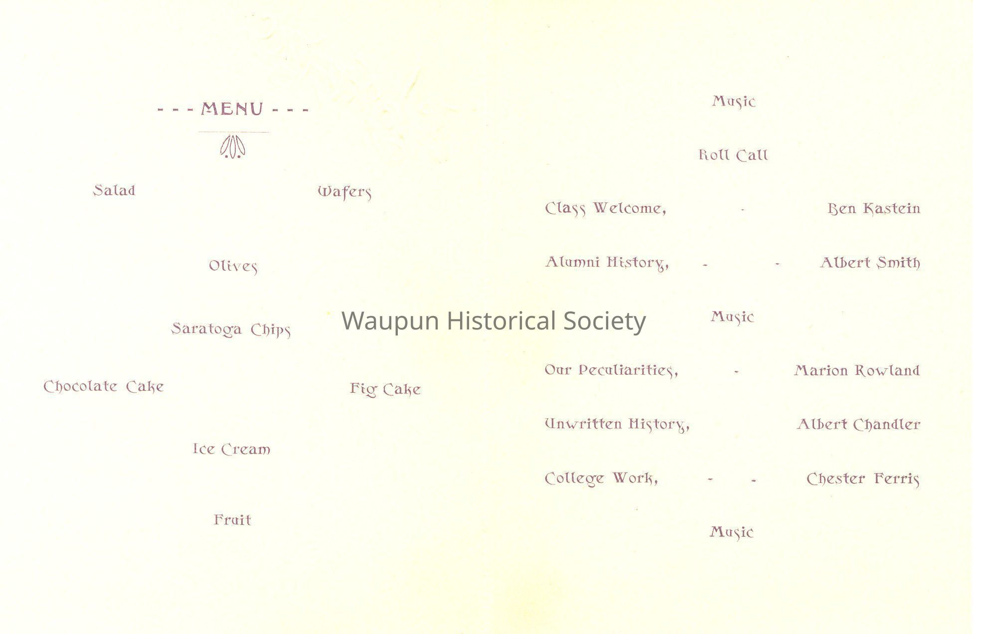 Salad, Wafers, Olives, Saratoga Chips, Chocolate Cake, Fig Cake, Ice Cream, Fruit.