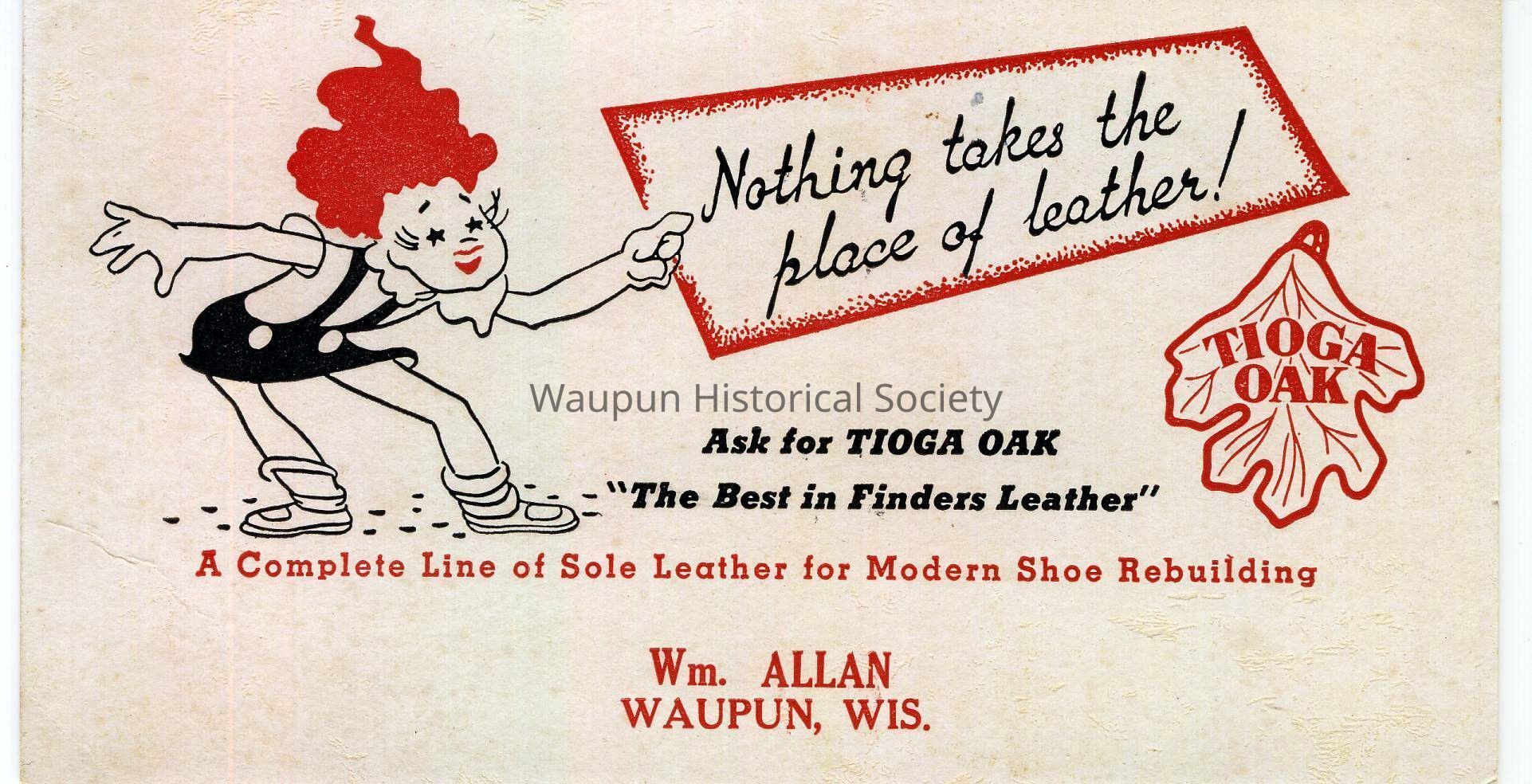 Local Business Memorabilia. This is a scan of a blotter collected by Jim Laird. It is from the William Allan company in Waupun, Wis. who apparently specialized in leather good and shoes.