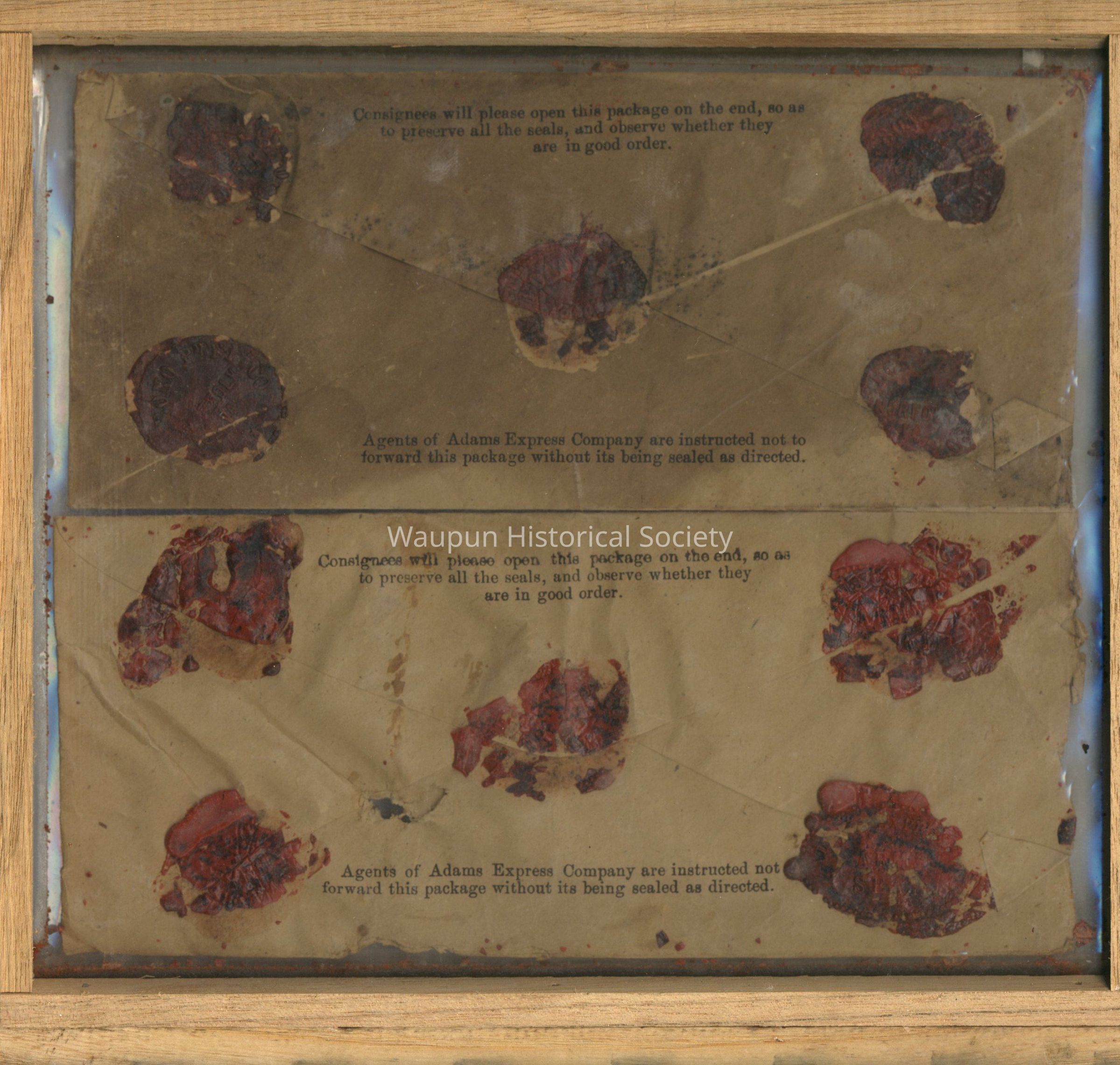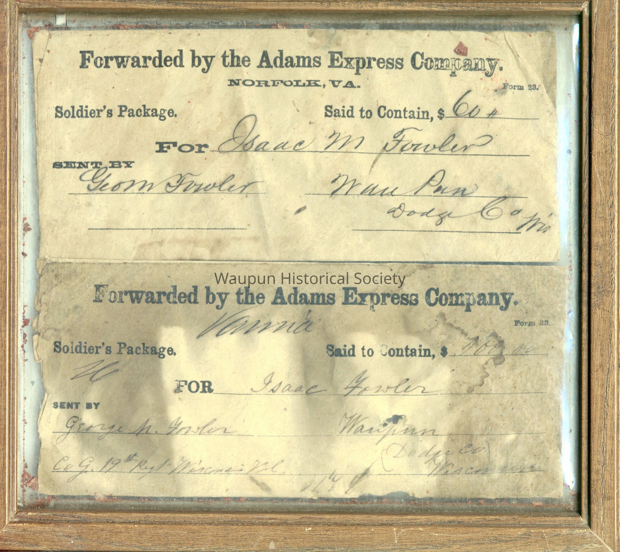 Civil War Letter Home. These envelopes, framed in an oak frame and double sided glass, appear to be money envelopes, sent from George M. Fowler of Company G. 19th Regimental Wisconsin Volunteers to Isaac M. Fowler.Acquisition