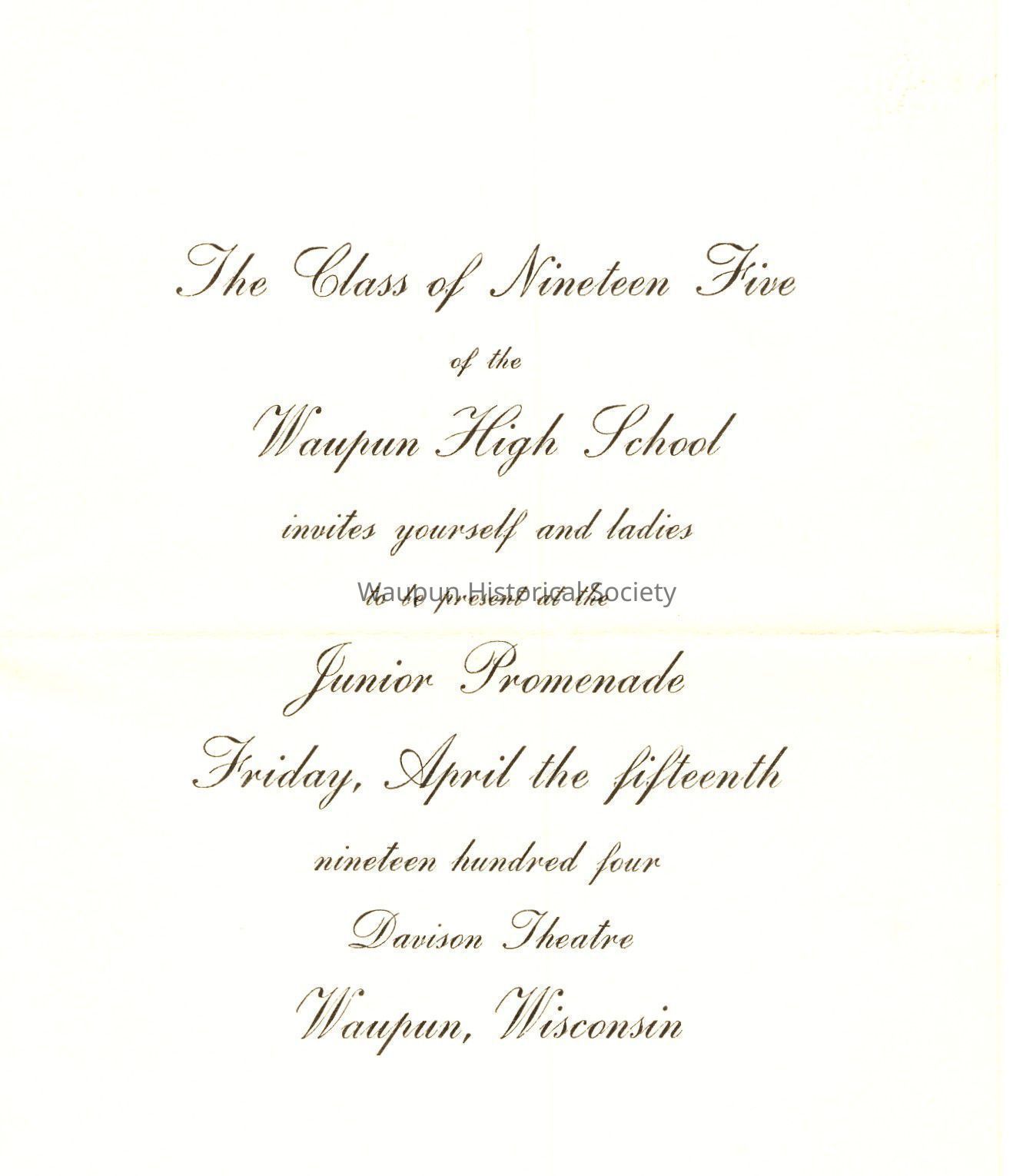 The Class of Nineteen Five of the Waupun High School invites yourself and ladies to be present at the JUNIOR PROMENADE Friday, April the fifteenth nineteen hundred four at Davison Theatre, Waupun, Wisconsin.
