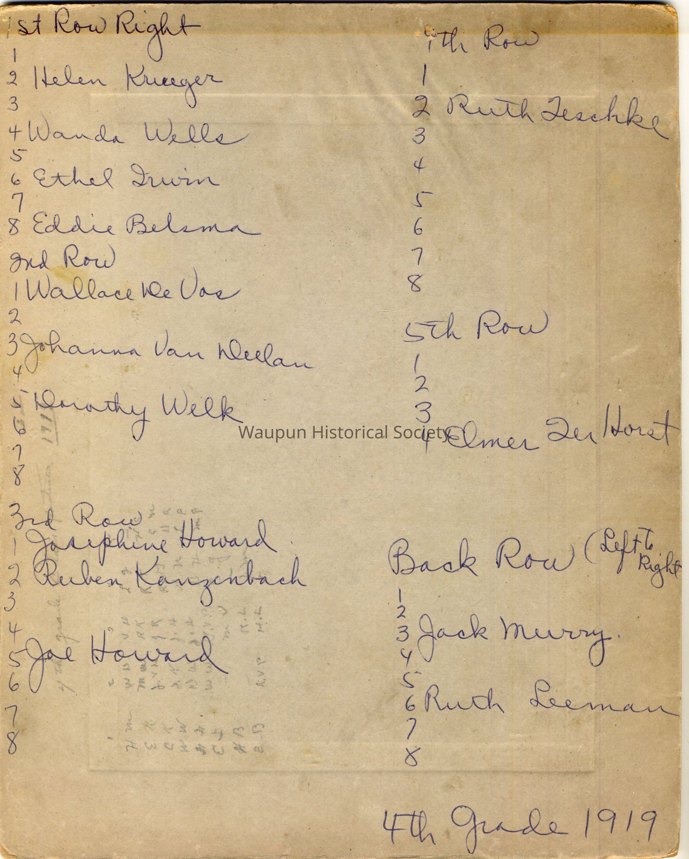 Black and white photo of 4th grade class of 1919. Some of the students are listed on back.