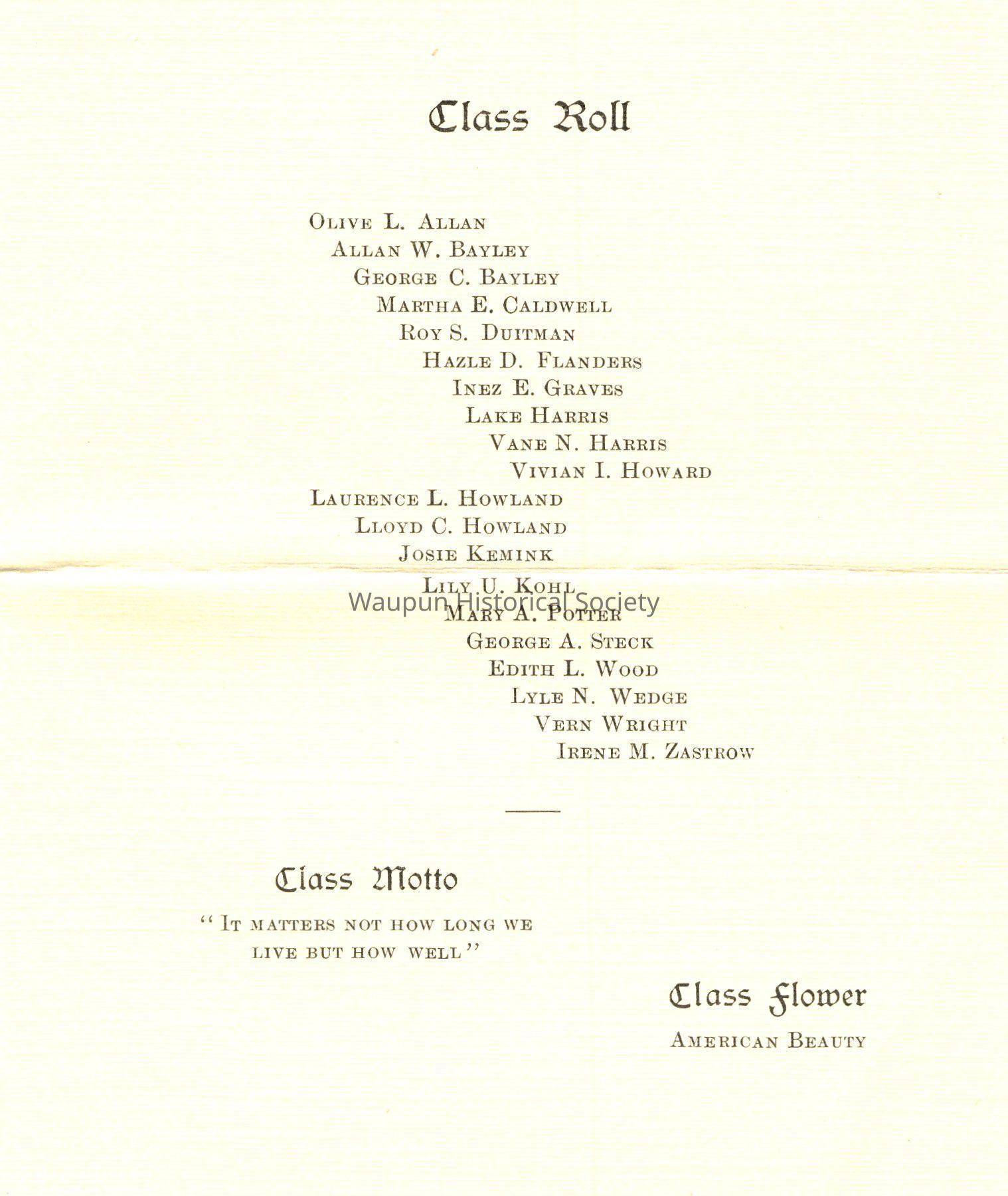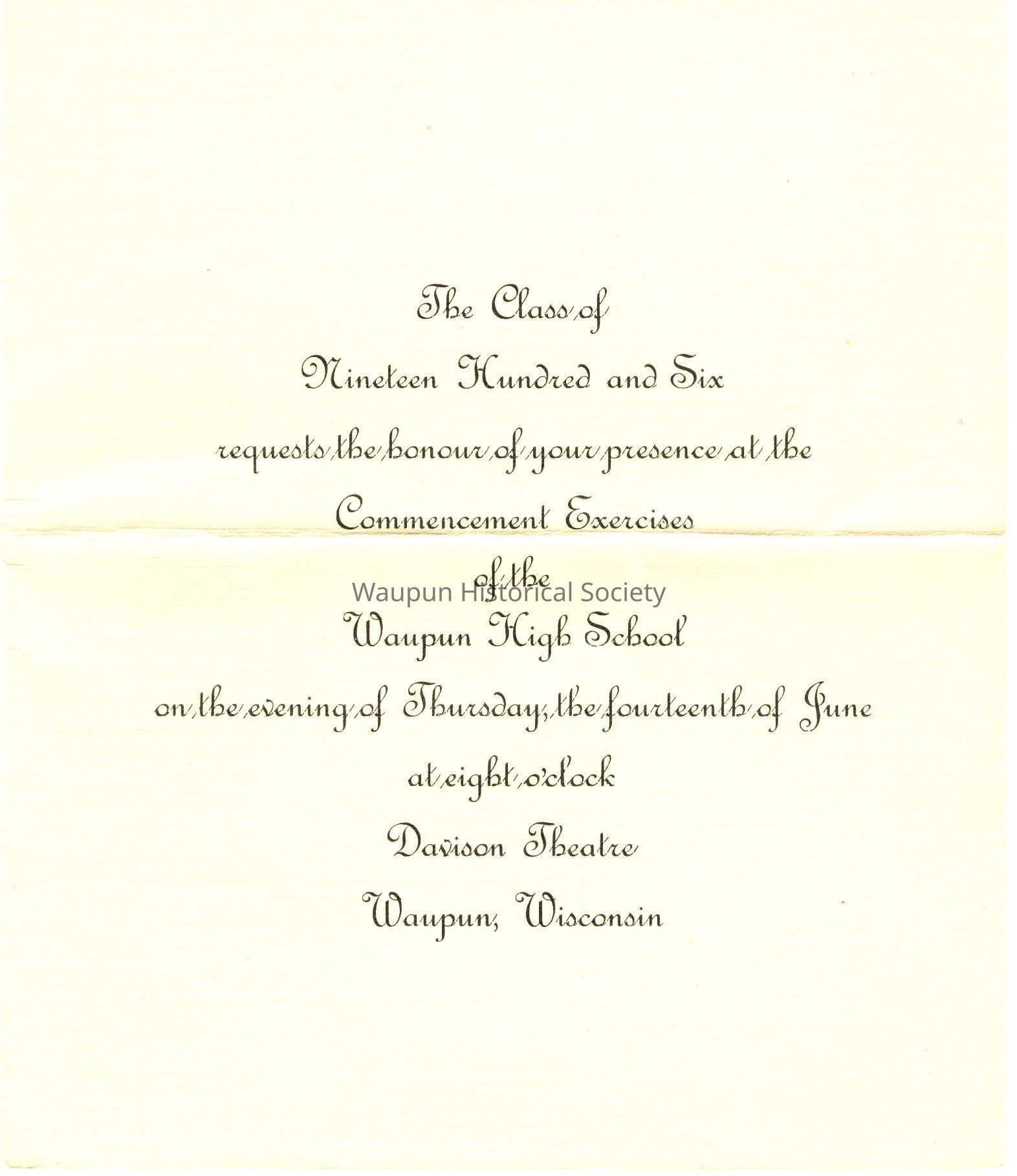 The Class of Nineteen Hundred and Six requests the honour of your presence at the Commencement Exercises of the Waupun High School on the evening of Thursday, the fourteenth of June at eight o'clock at Davison Theatre, Waupun, Wisconsin.