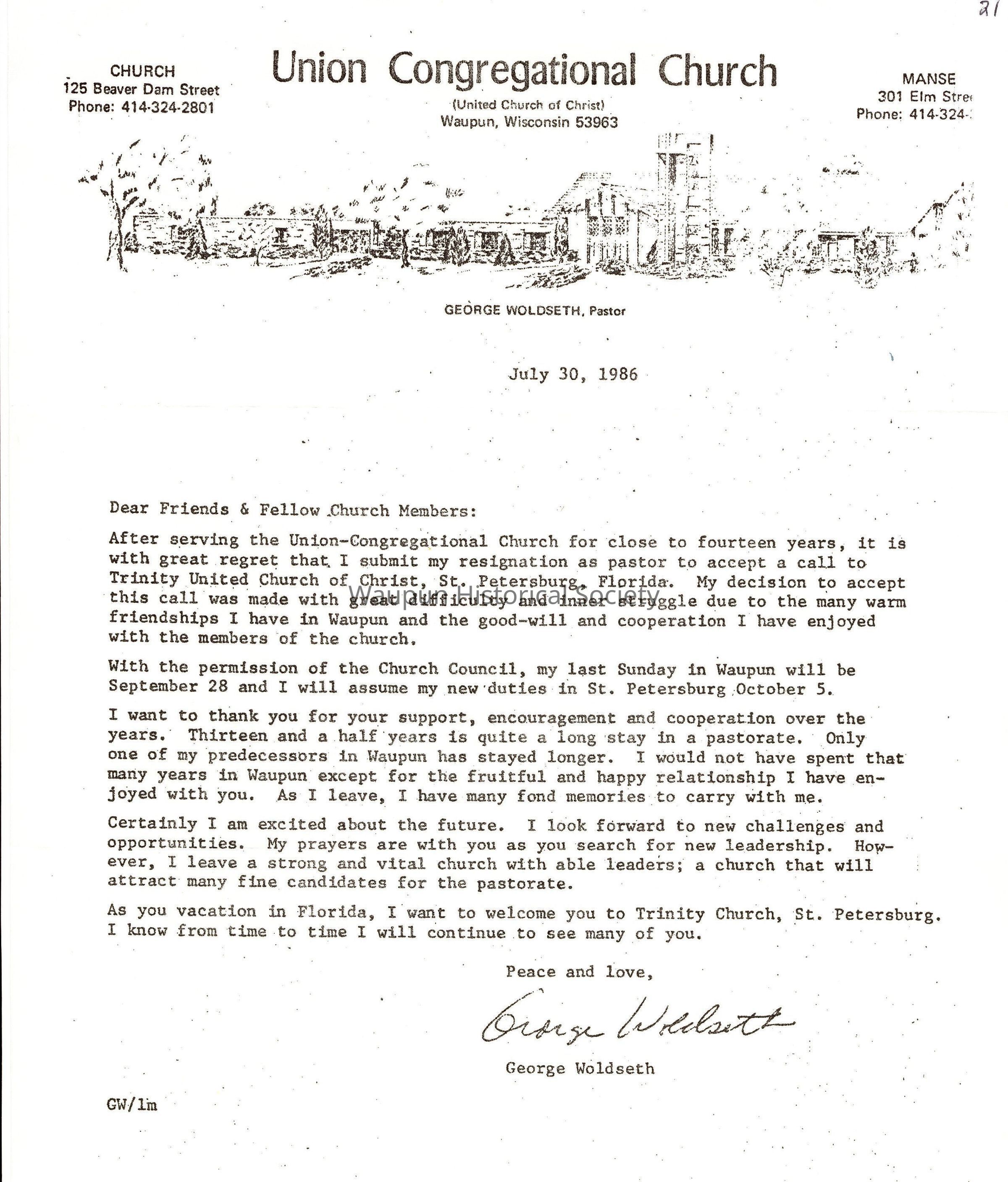 After serving the Union-Congregational Church for close to fourteen years, it is with great regret that. I submit my resignation as pastor to accept a call to Trinity United Church of Christ, St. Petersburg, Florida. My decision to accept this call was made with great difficulty and inner struggle due to the many warm friendships I have in Waupun and the good-will and cooperation I have enjoyed with the members of the church.