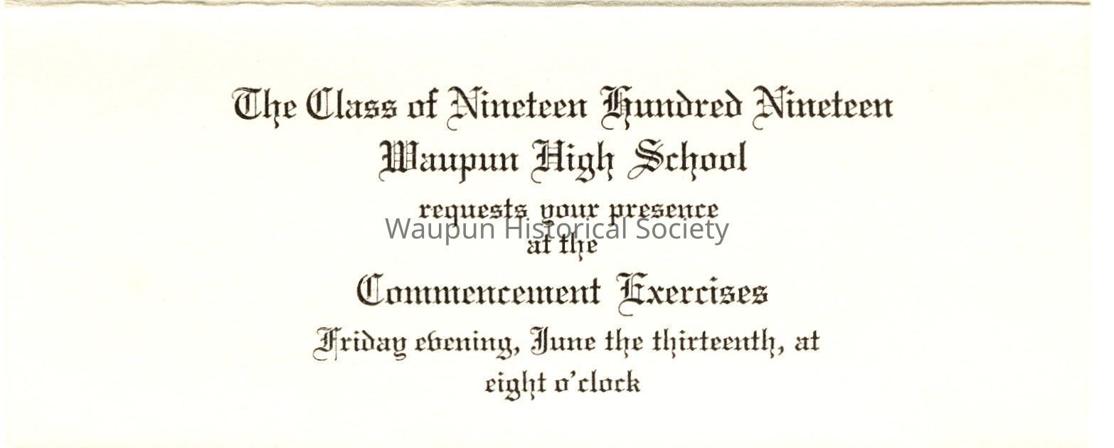 The class of Nineteen Hundred Nineteen Waupun High School requests your presence at the Commencement Exercises Friday evening, June the thirteenth, at eight o'clock.Acquisition