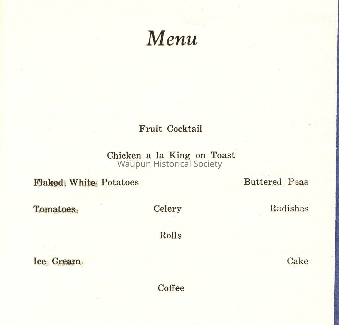 Fruit Cocktail, Chicken a la King on Toast, Flaked White Potatoes, Buttered Peas, Tomatoes, Celery, Radishes, Rolls, Ice Cream, Cake and Coffee.Acquisition