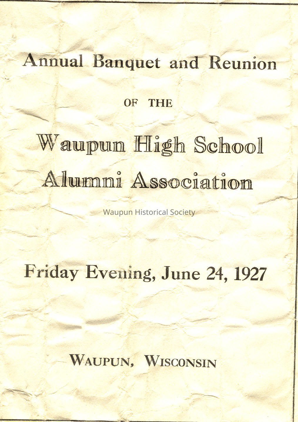 Annual Banquet and Reunion of the Waupun High School Alumni Association, Friday Evening, June 24, 1927, WAUPUN, WISCONSIN.