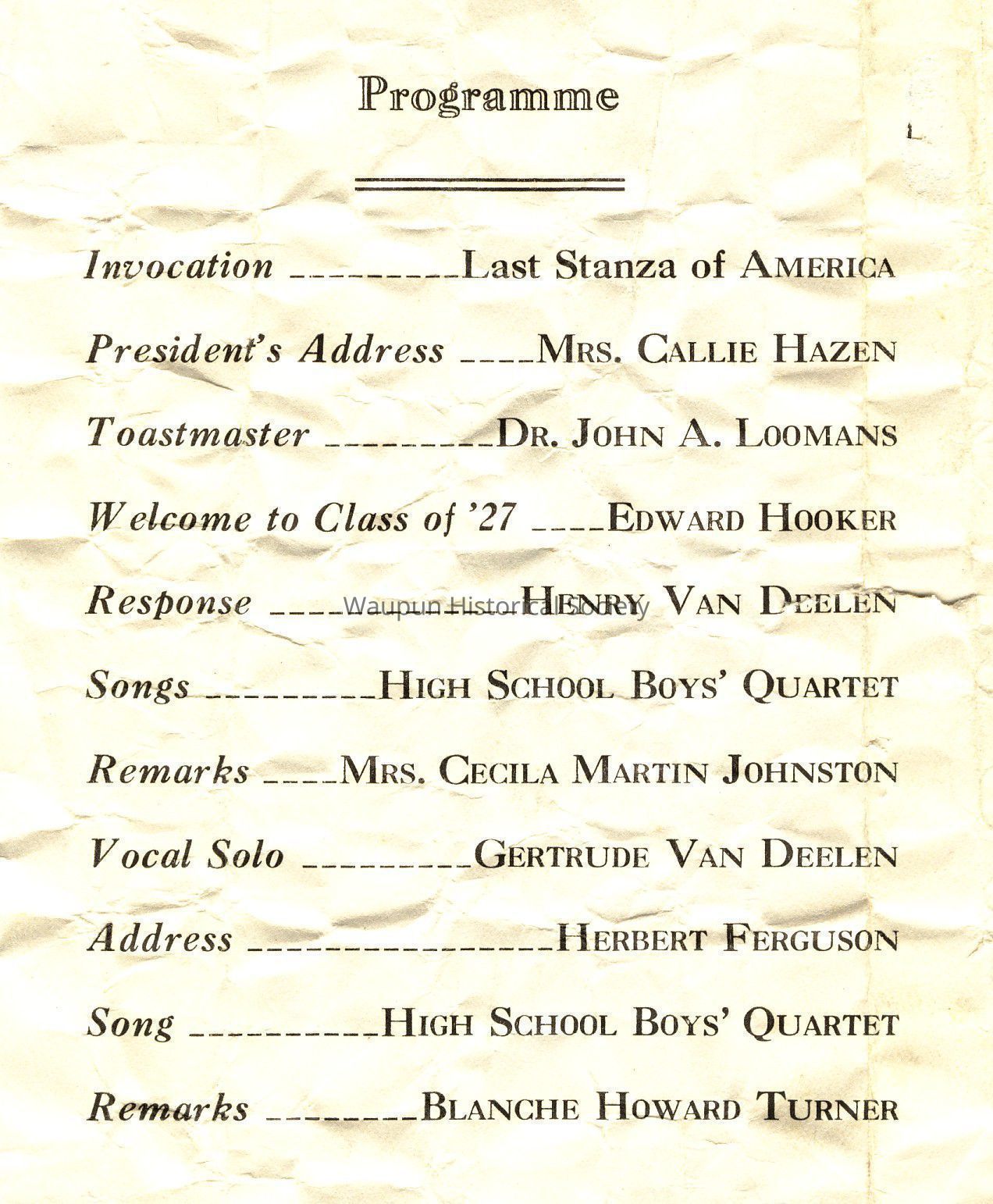 Program, Alumni Banquet, Waupun High School, 1927Entry/Object ID