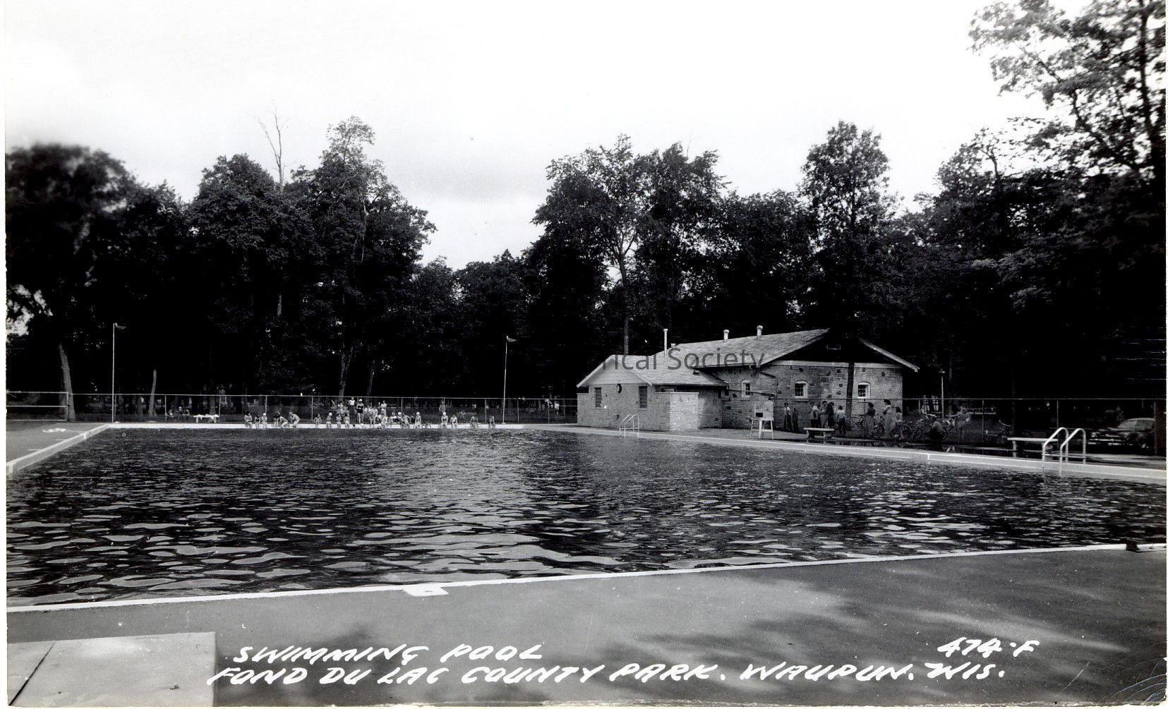 Postcard, Parks, Fond du Lac County Park Pool, #474-F. Postcard of Fond du Lac County Park Swimming pool. This photo shows the WPA project pool house.Acquisition