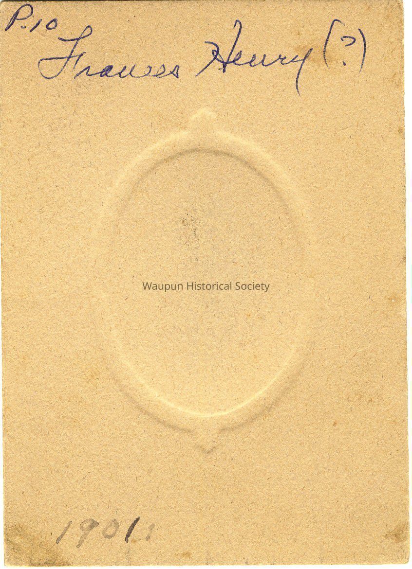 Portrait, P. 10 from collection of Leona Nagler. Frances Henry(?) is written on back of photo. The year 1901 is also indicated.