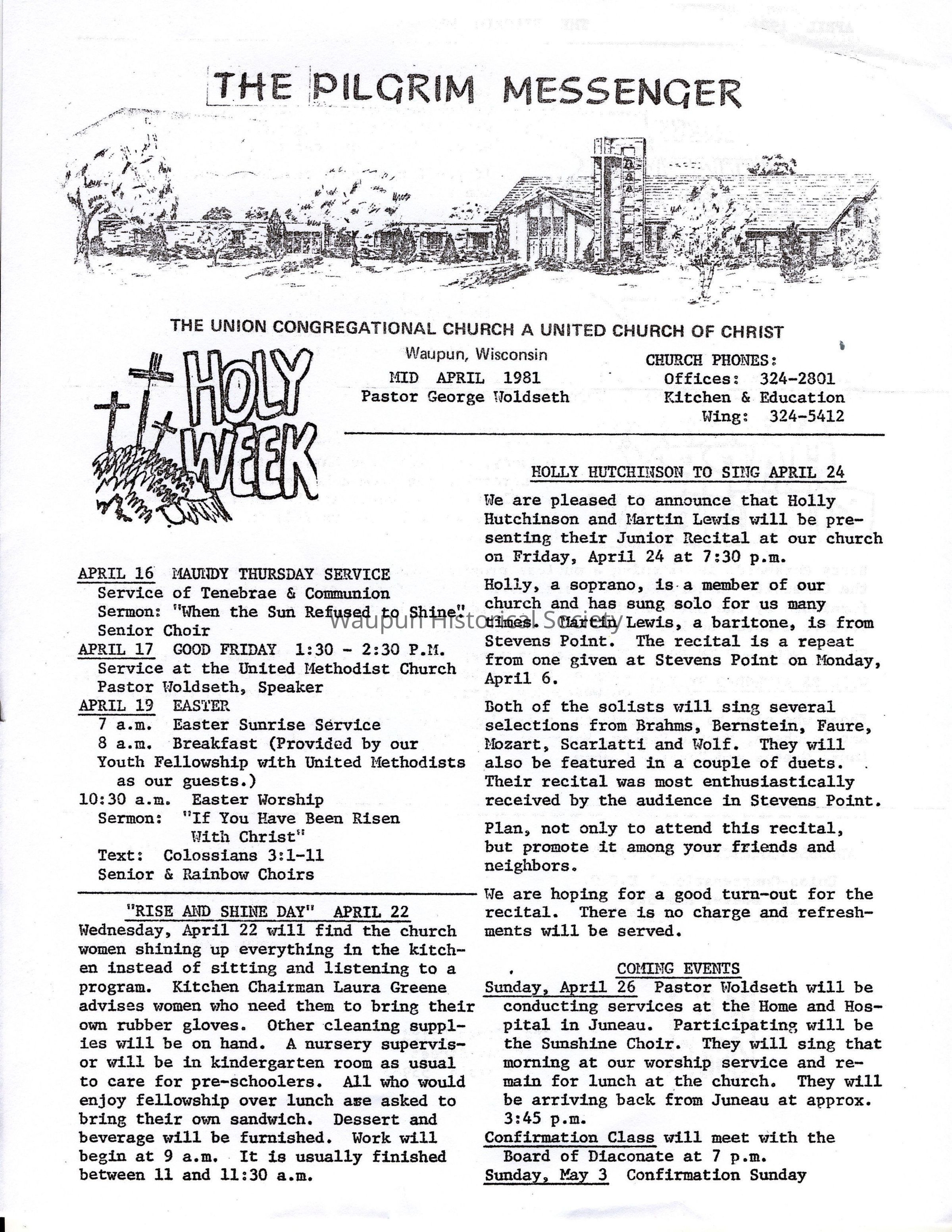 Holly Hutchingon To Sing, from The Pilgrim Messenger of the Union Congregational Church in Waupun, WI. The messenger is dated Mid. April, 1981.