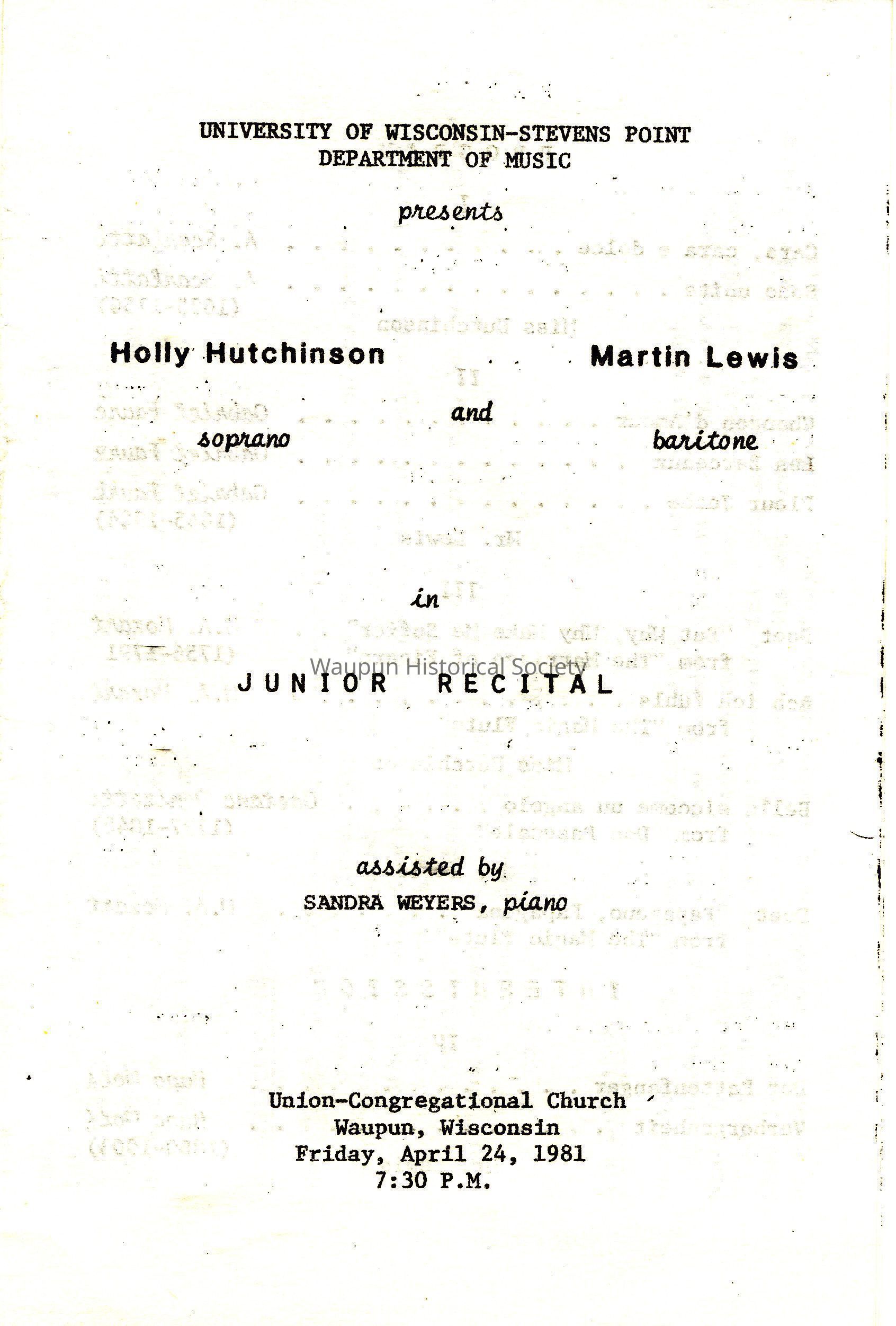 Program, UW-Stevens Point Music Department, Holly Ann Hutchinson and Martin Lewis. Holly Ann Hutchinson and Martin Lewis program. This program is from the Junior Recital that Holly Ann Hutchinson and Martin Lewis held at the Union Congregational Church on April 24, 1981. The program was scanned and has been entered but the program was not OCRed.Acquisition