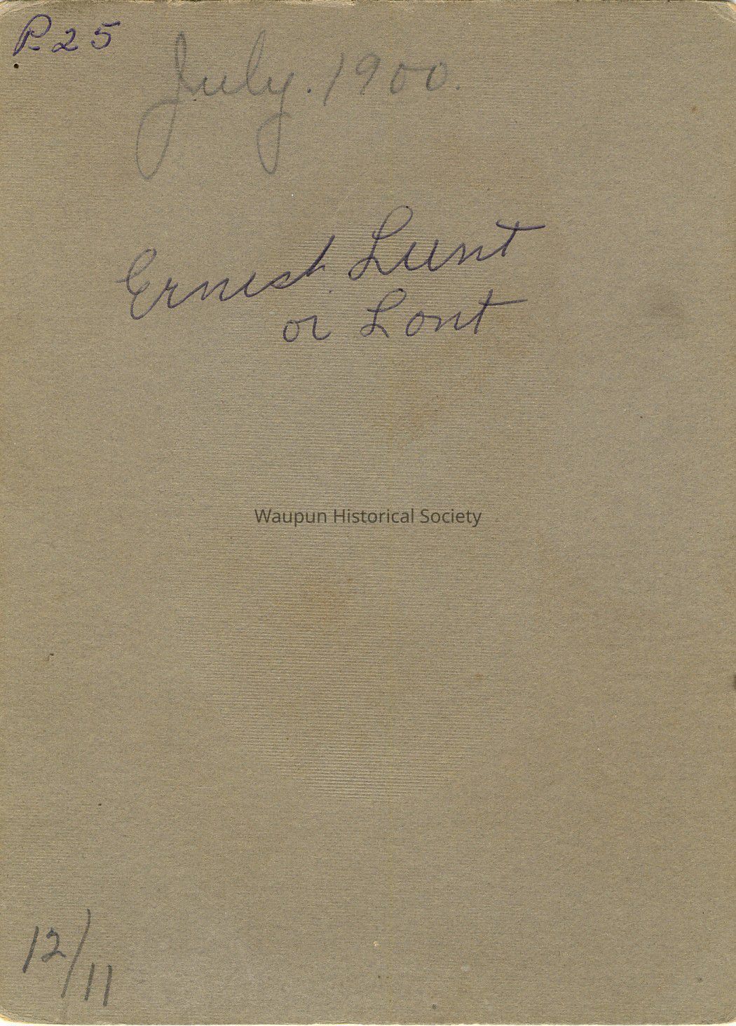 Portrait, P. 25 from Leona Nagler's collection. We believe this to be Ernest Lunt, or Lont as indicated on back. July 1900 is also indicated.Acquisition