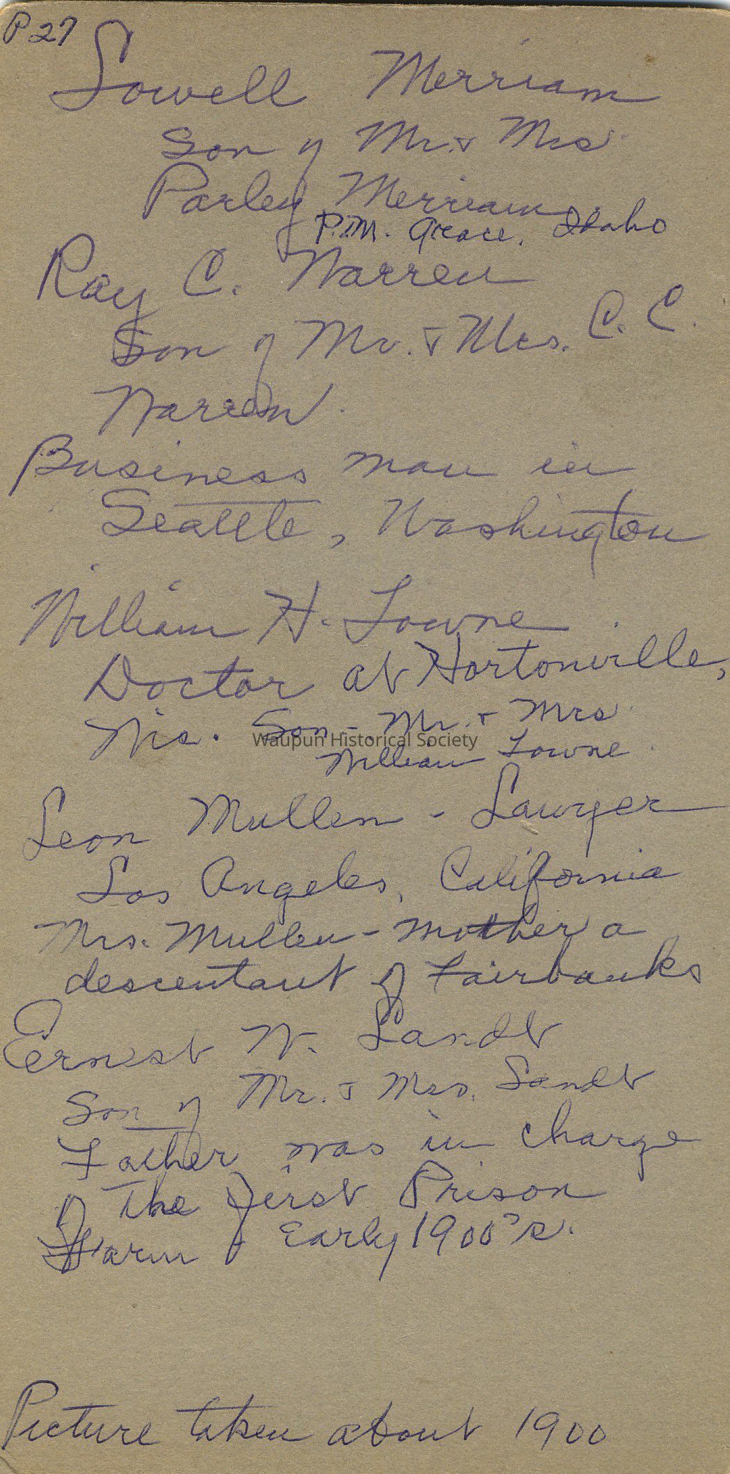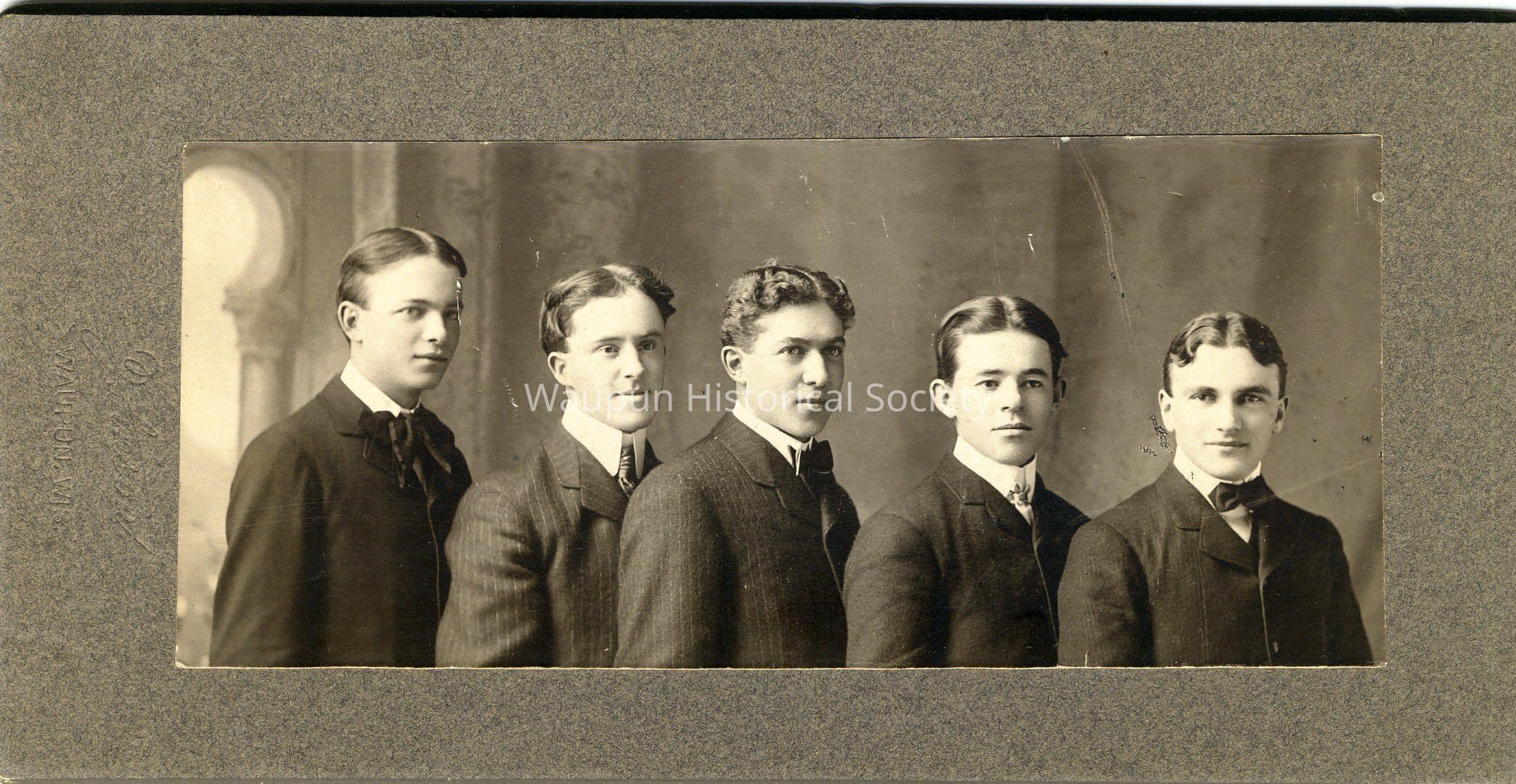 Portrait, P. 27 from collection of Leona Nagler. Picture taken about 1900. Men listed on back are as follows: Lowell Merriam, son of Mr. & Mrs. Parley Merriam; Ray C. Warren, son of Mr. & Mrs. C. E. Warren, business man in Seattle, Washington.; William H. Towne, doctor at Hortonville, Wis., son of Mr. & Mrs. William Towne; Leon Mullen, lawyer in Los Angles, Californis, son of Mrs. Mullen who was a descendant of the Fairbanks; Ernest W. Landt, son of Mr. & Mrs. Landt. Father was in charge of the first Prison Farm in early 1900's.Acquisition