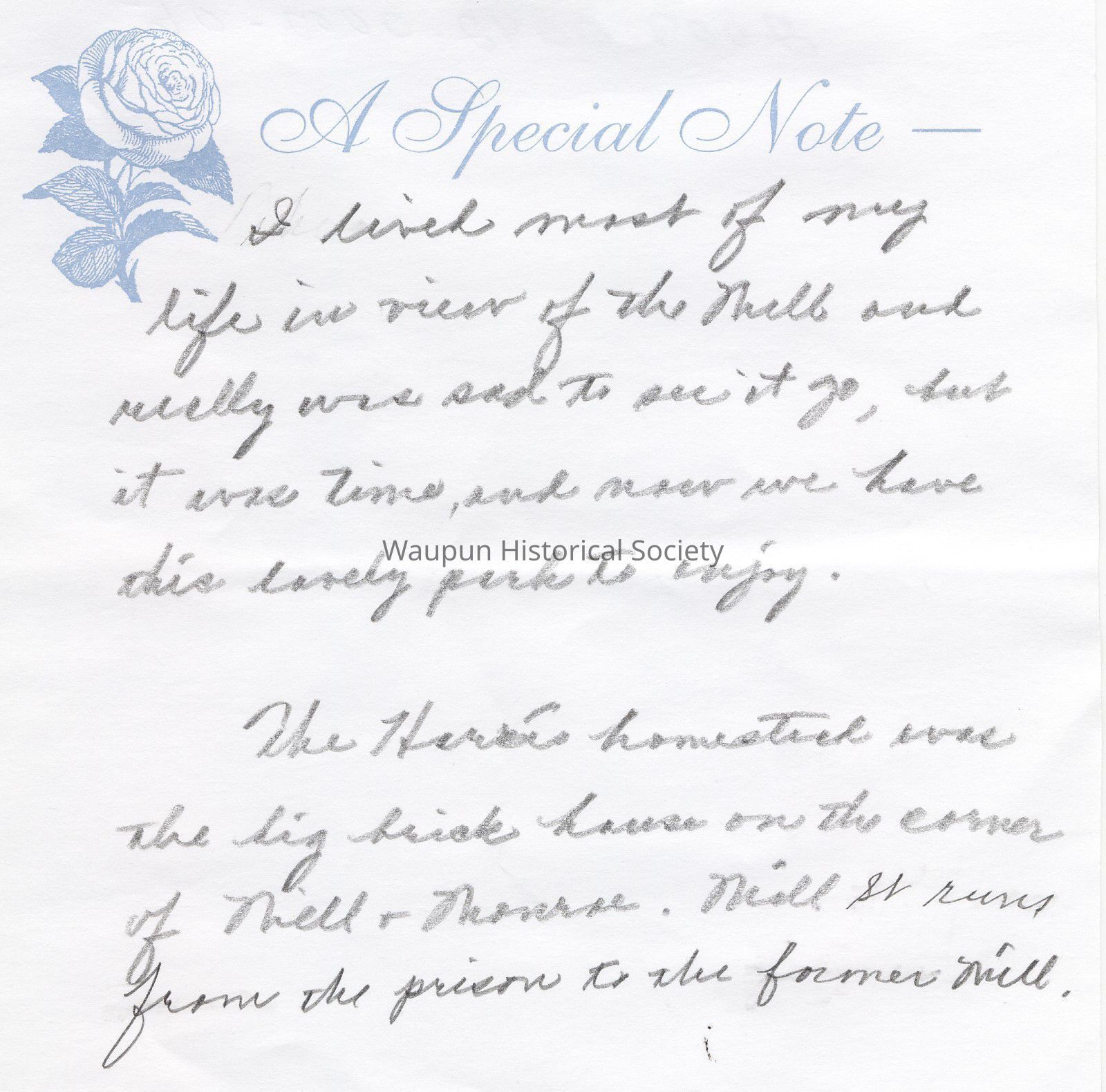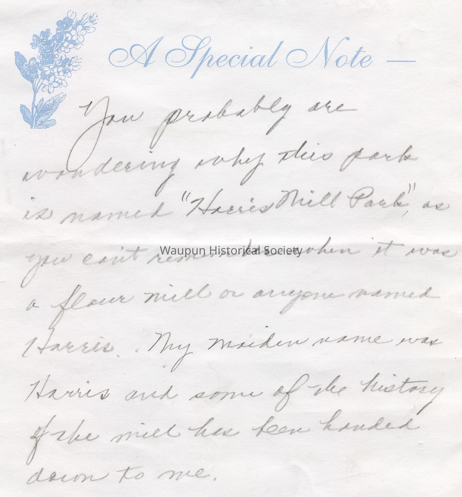 You probably are wondering why this park is named "Harris Park" as you can't remember when it was a flour mill or anyone named Harris. My maiden name was Harris and some of the history of the mill has been handed down to me.