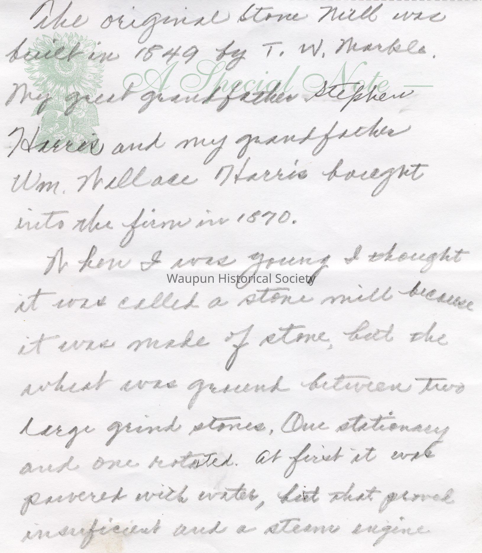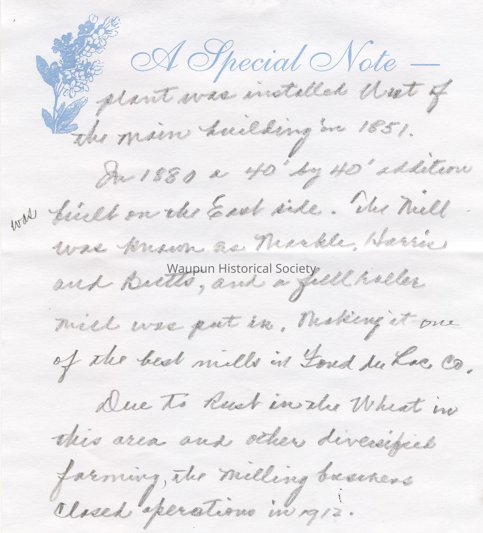 In 1880 a 40' by 40' addition was built on the east side. The mill was known a Marble, Harris and Butts, and a fifth roller mill was put in making it one of the best mills in Fond du Lac Co.