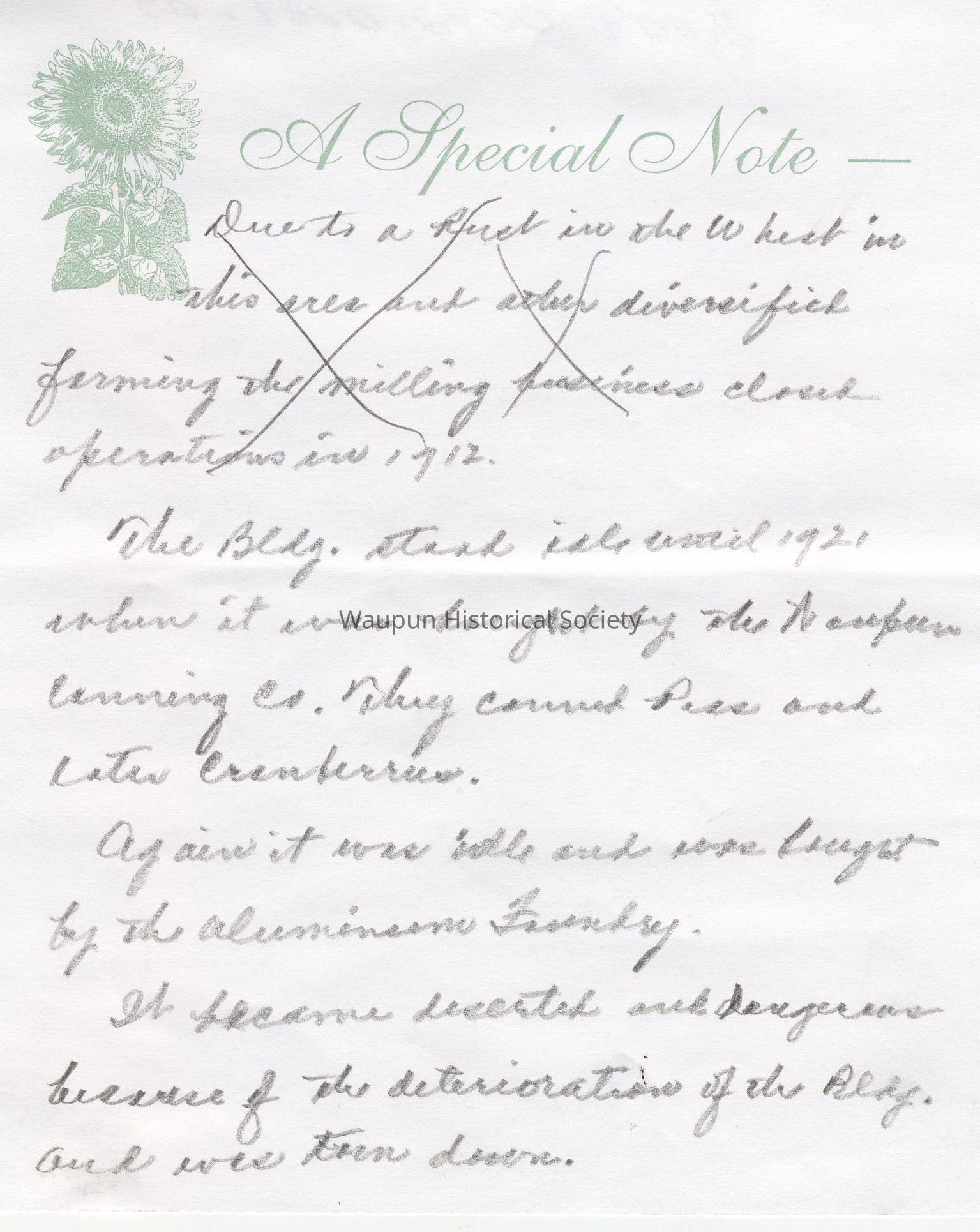 The Bldg. Stood idle until 1921, when it was bought by the Waupun Canning Co. They canned peas and cranberries.
