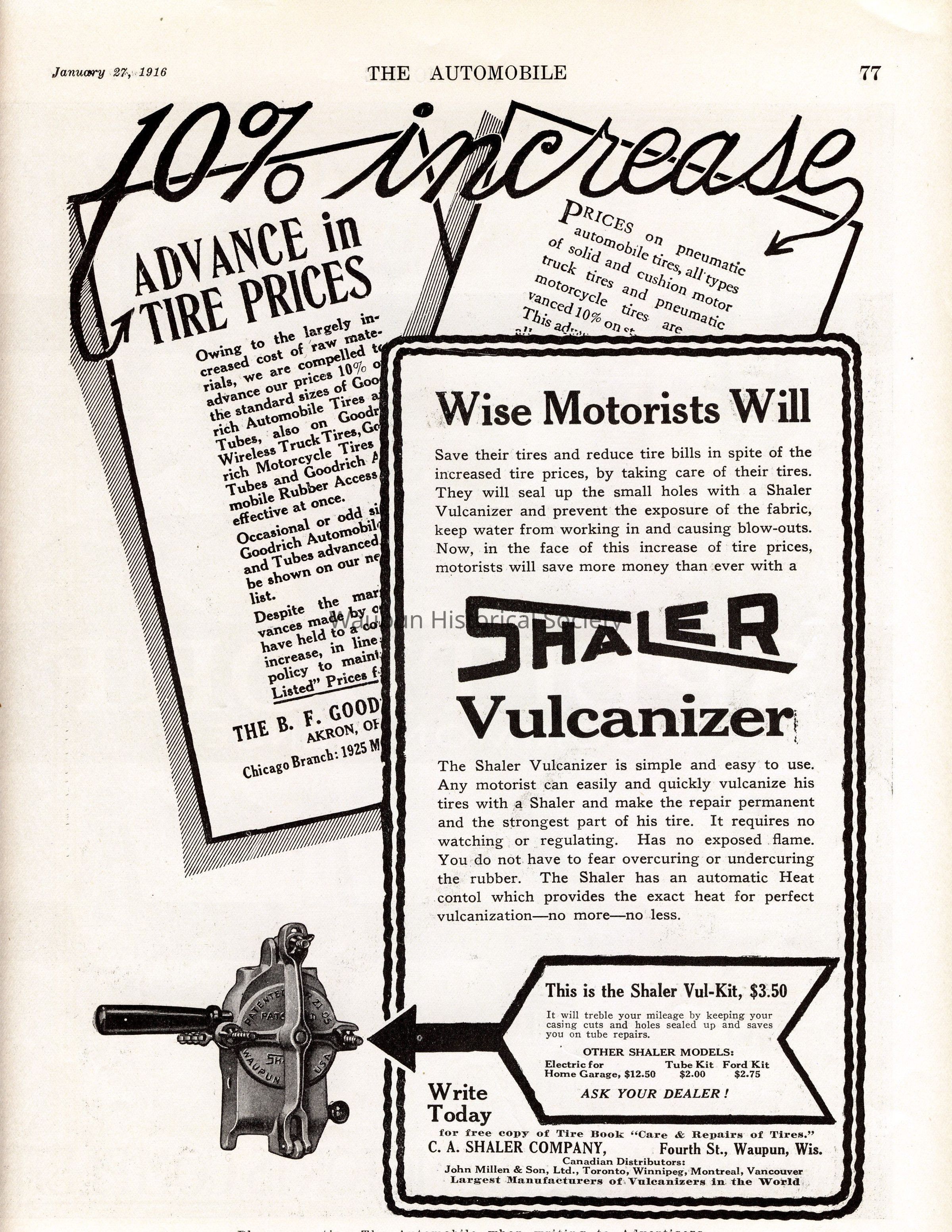 Shaler Vulcanizer Ad in on page 77 of the January 27, 1916 issue of "The Automobile" magazine.