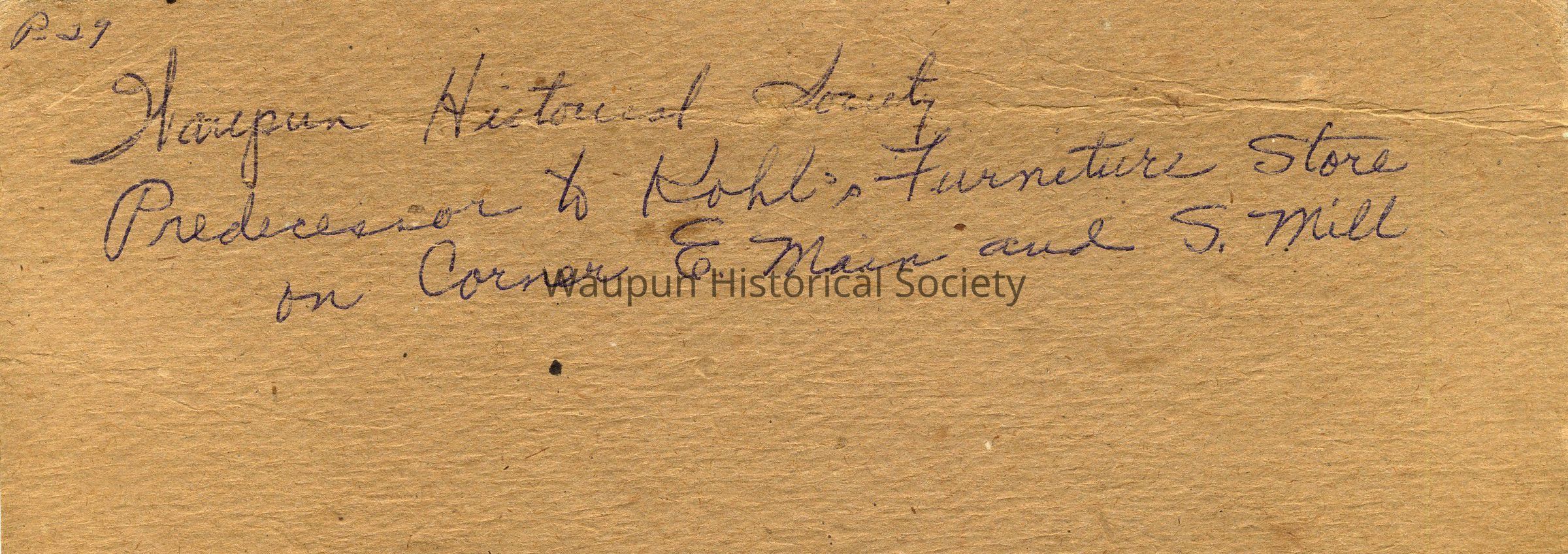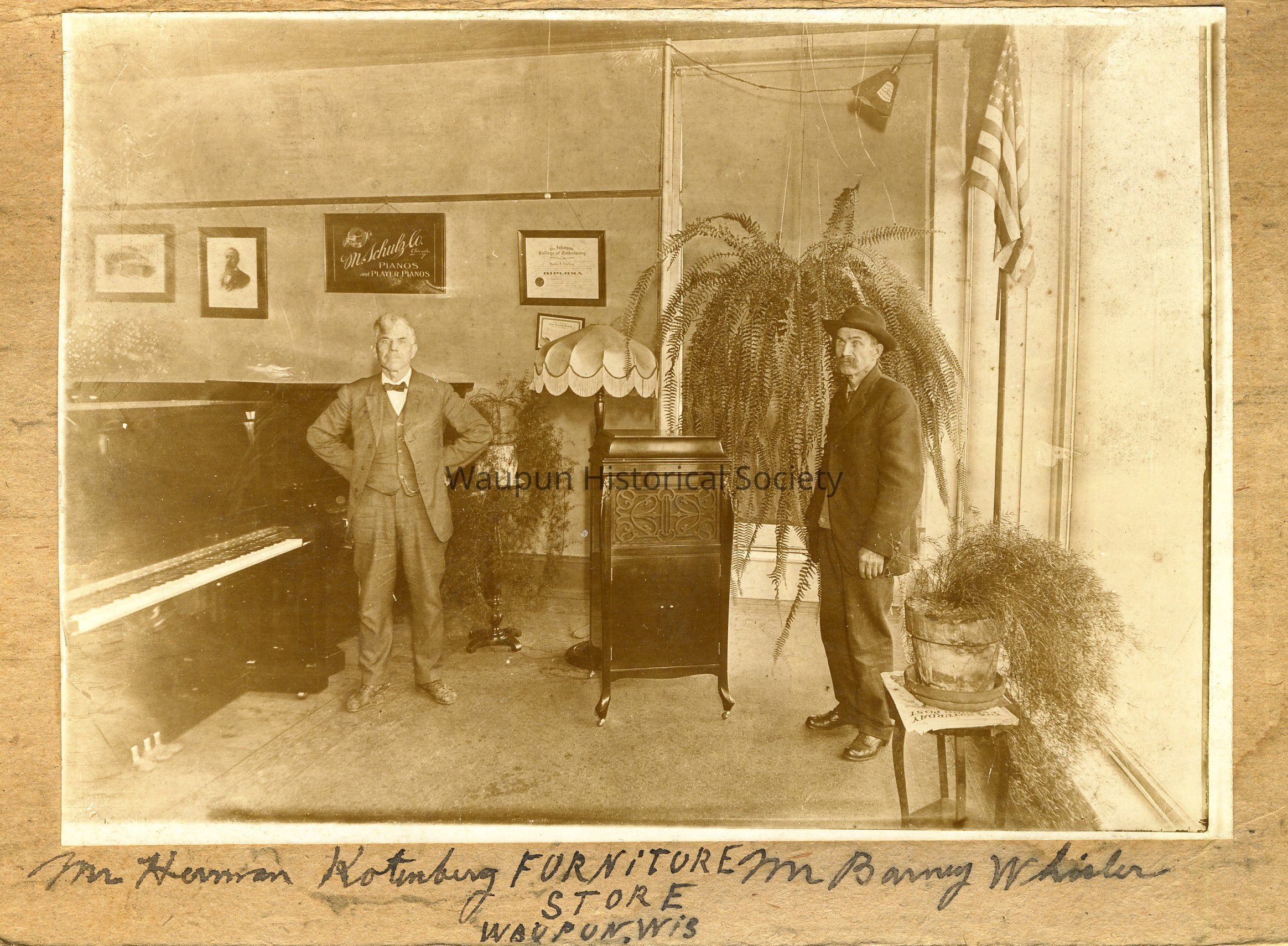 Portrait, P. 29 from collection of Leona Nagler. Mr. Herman Kotenberg and Mr. Barney Whisler Furniture Store, Waupun, Wis. As indicated on back of photo, this was the predecessor to Kohl's Furniture Store on the corner of E. Main and S. Mill St., Waupun, Wis.Acquisition