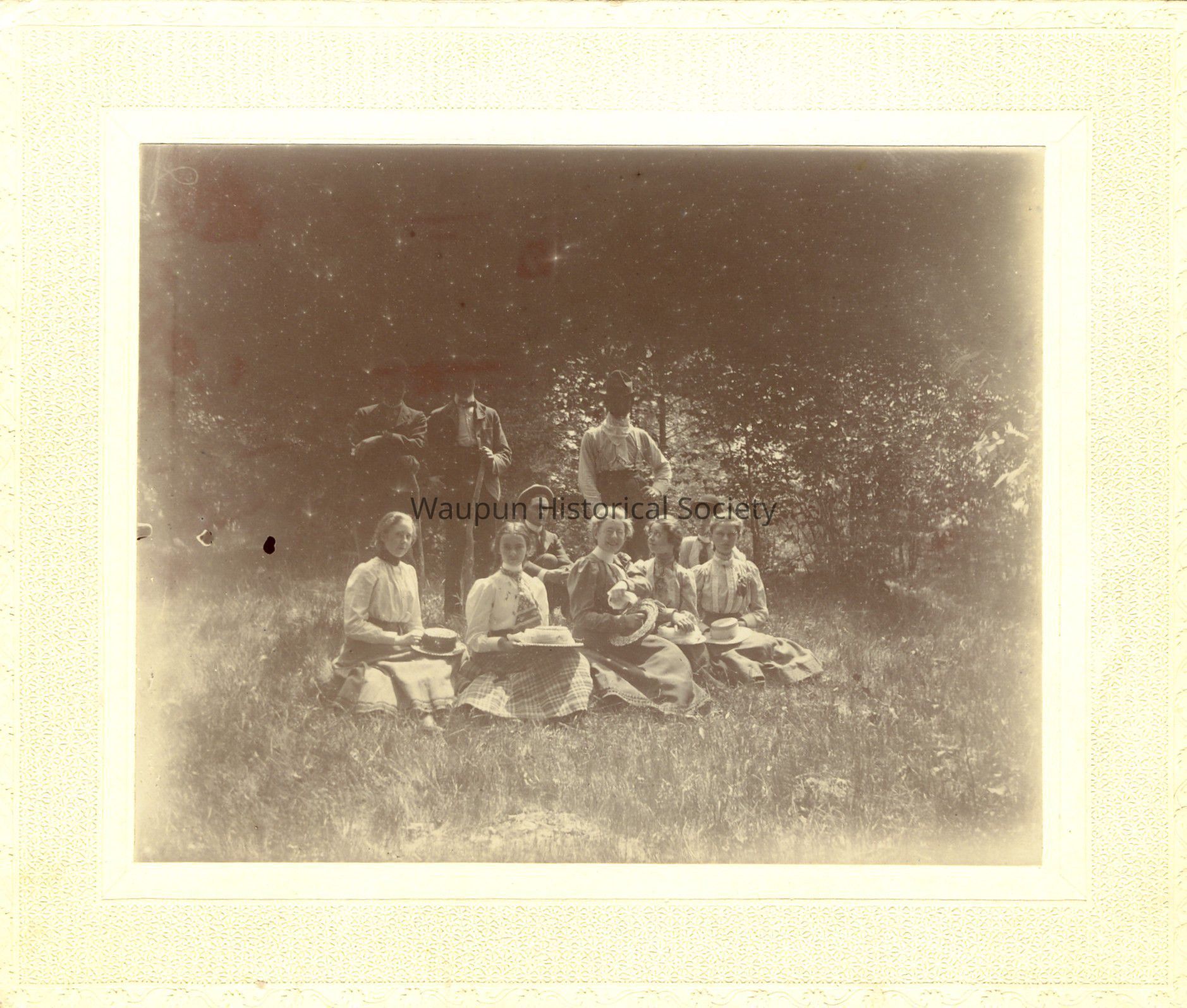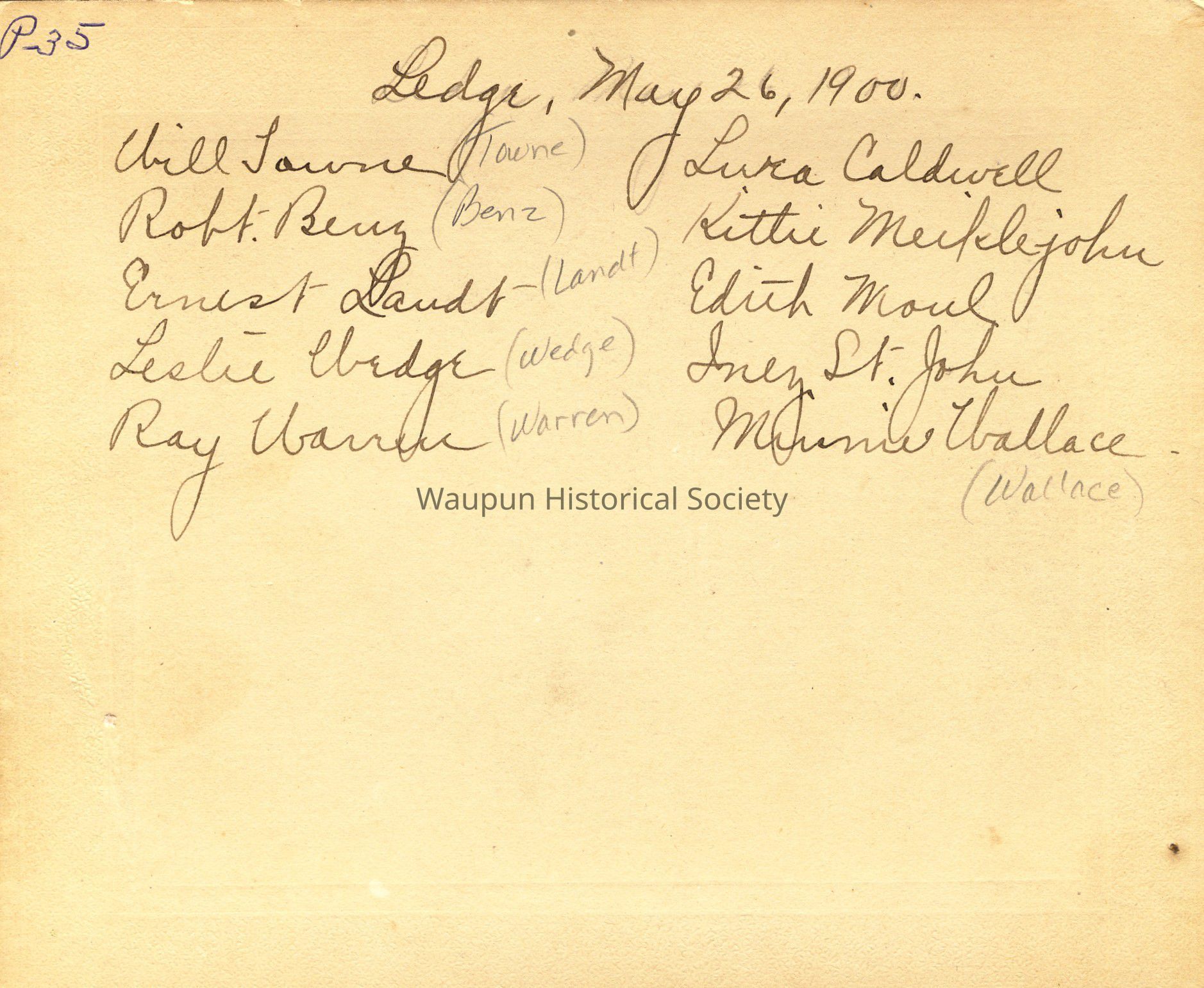 Portrait, P. 35 from collection of Leona Nagler. Writing on back of photo indicates that this was taken May 26, 1900, on the Ledge. The group are listed as: Will Towne, Robert Benz, Ernest Landt, Leslie Wedge, Ray, Warren, Lura Caldwell, Kittie Meiklejohn, Edith Moul, Inez St. John, and Minnie Wallace.Acquisition