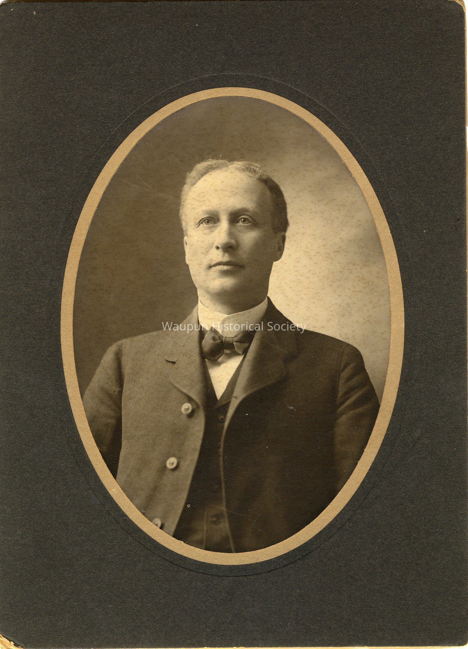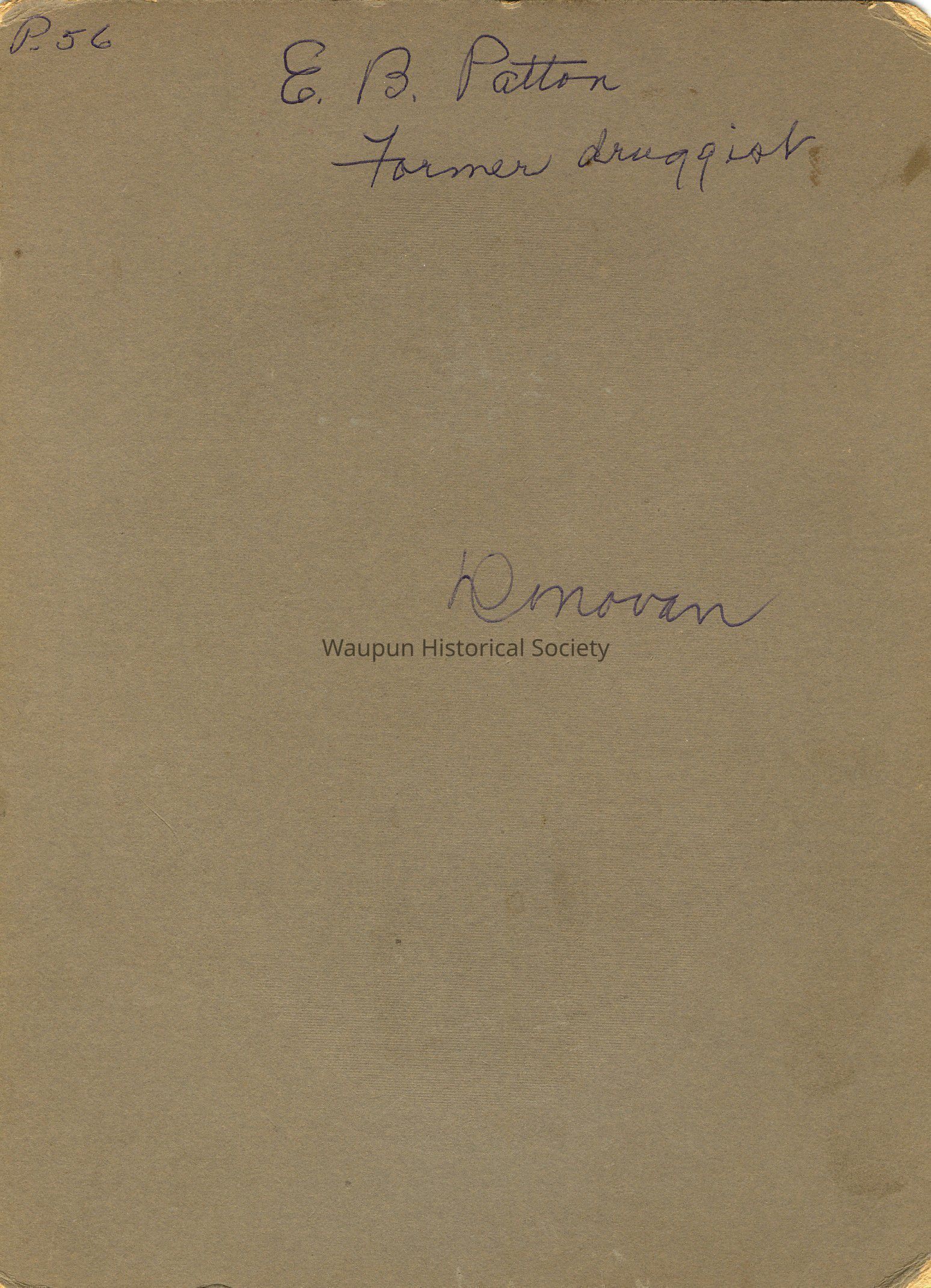 Portrait, P. 56 from collection of Leona Nagler. We believe this to be E. B. Patton, former druggist of Waupun. The name Donovan also appears on the back of photo.Acquisition