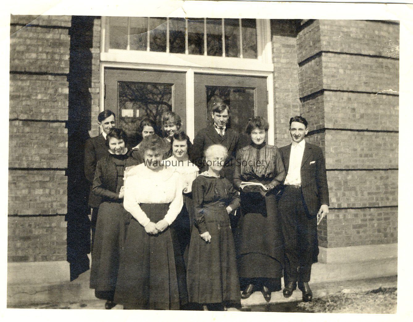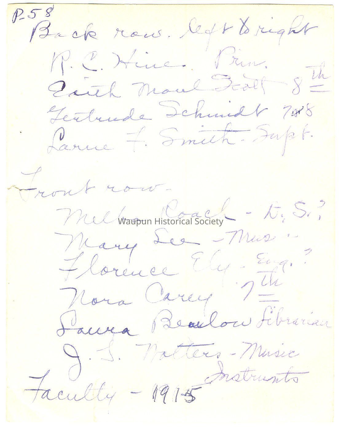 Front row, left to right: Melba Roach, D. S.?; Mary Lee, Music; Florence Ely, English; Nora Carey, 7th grade; Laura Beaulow, Librarian; J. T. Walters, Music and instruments.Acquisition
