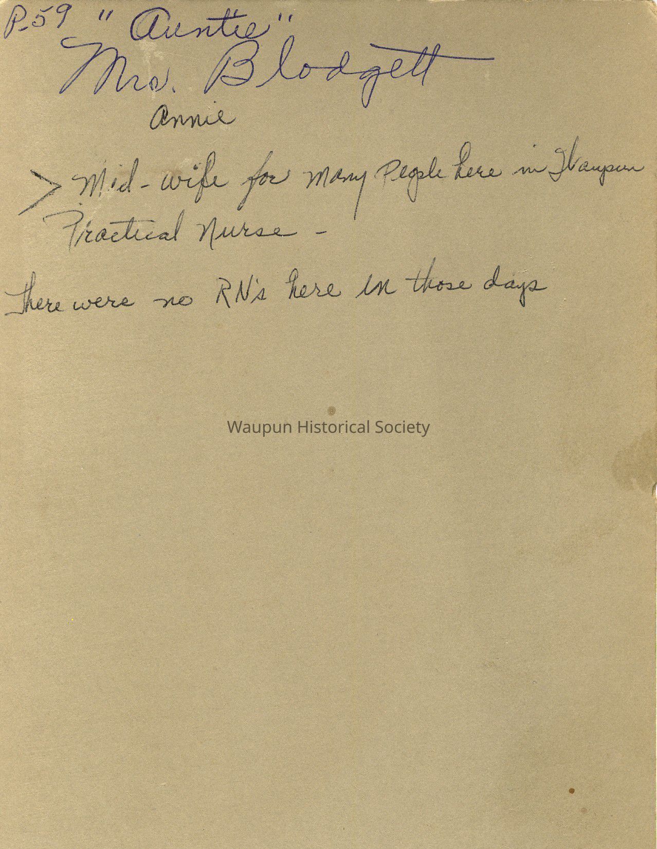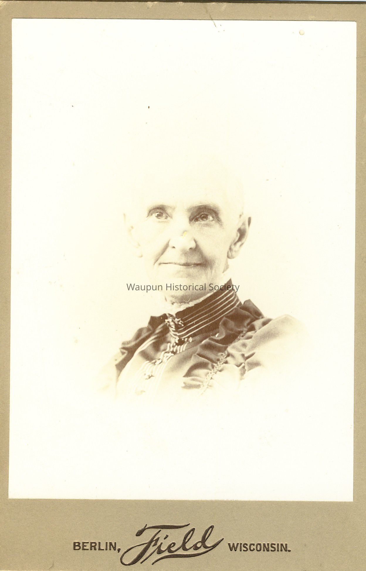 Portrait, P. 50 from collection of Leona Nagler. We believe this to be "Auntie" Mrs. Annie Blodgett as indicated on back of photo. She was mid-wife for many women in Waupun. She was a practical nurse. There were no RNs in Waupun in those days. No year is indicated.Acquisition