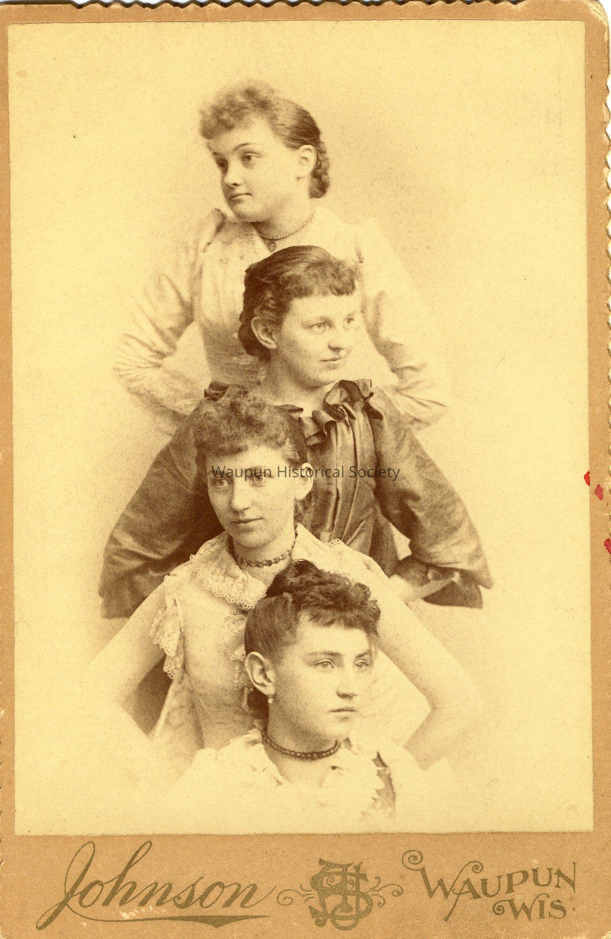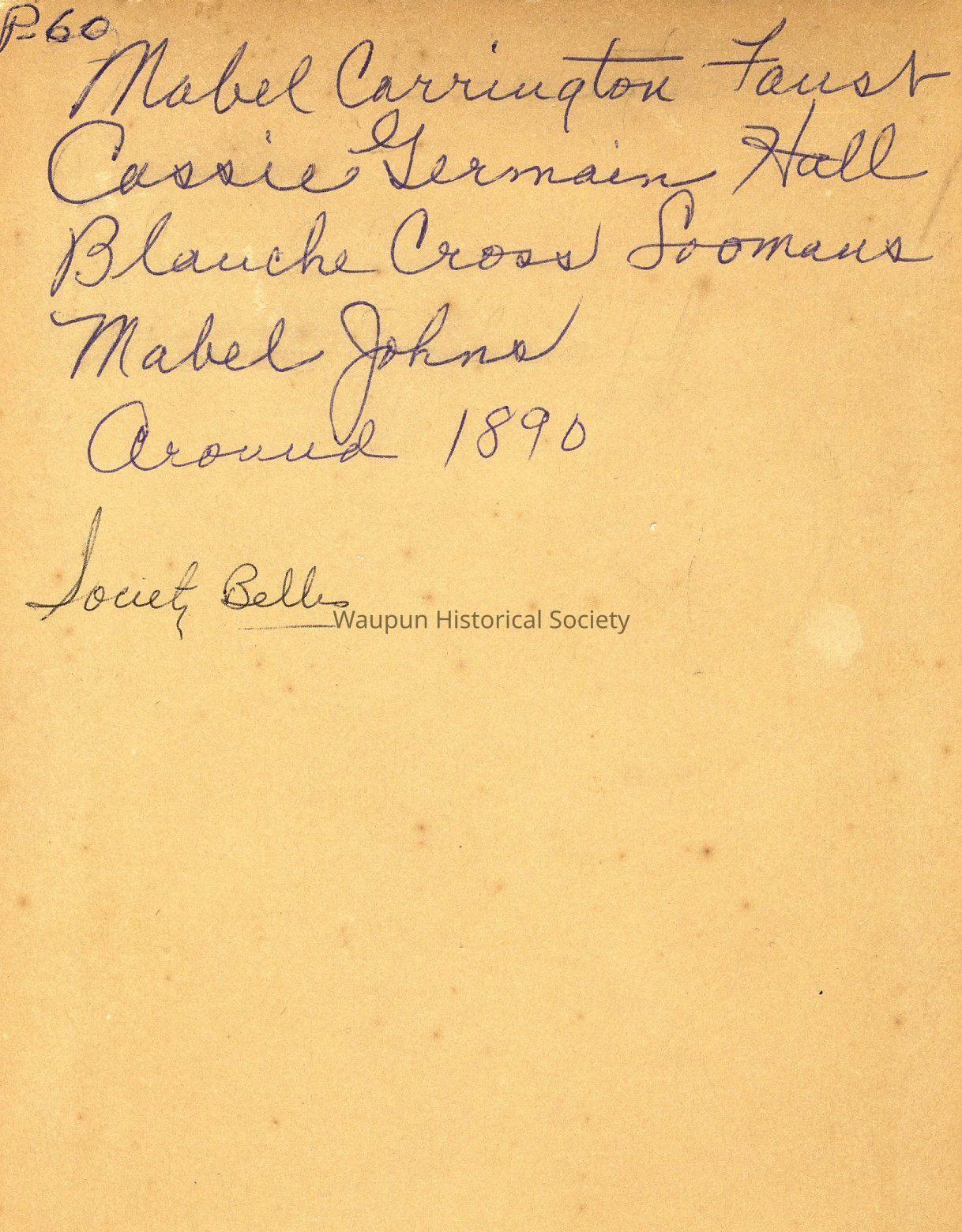 Cabinet Card, Johnson, P. 60 from collection of Leona Nagler. Back of photo indicates that these women are Society Belles around 1890. They are as follows: Mabel Carrington Faust, Cassie Germain Hall, Blanche Cross Loomans, and Mabel Johns.Acquisition