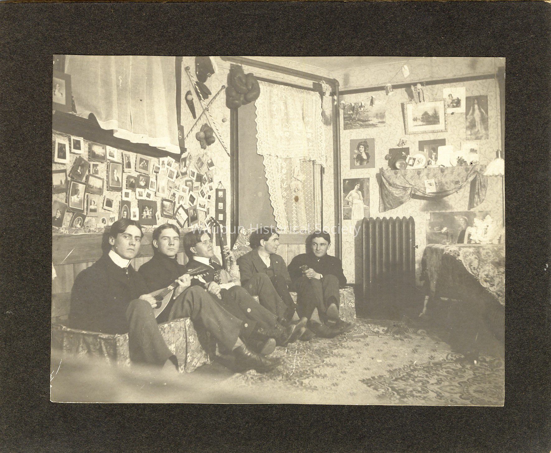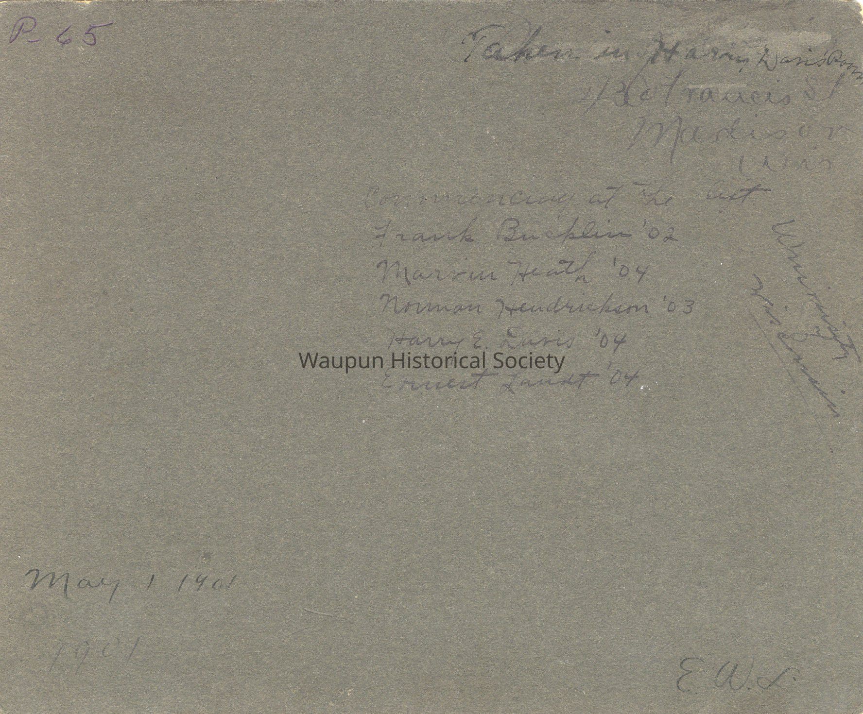 P. 65 from collection of Leona Nagler. Taken in Harry Davis's room at the University of Wisconsin, 430 Francis St., Madison, Wisconsin, May 1, 1901. Individuals shown with Harry are as follows: Frank Bucklin, (1902), Marvin Heath, (1904), Norman Hendrickson, (1903), Harry Davis, (1904), Ernest Lundt, (1904). Not sure, but the years next to their names could indicate the year they graduated from the University.Acquisition