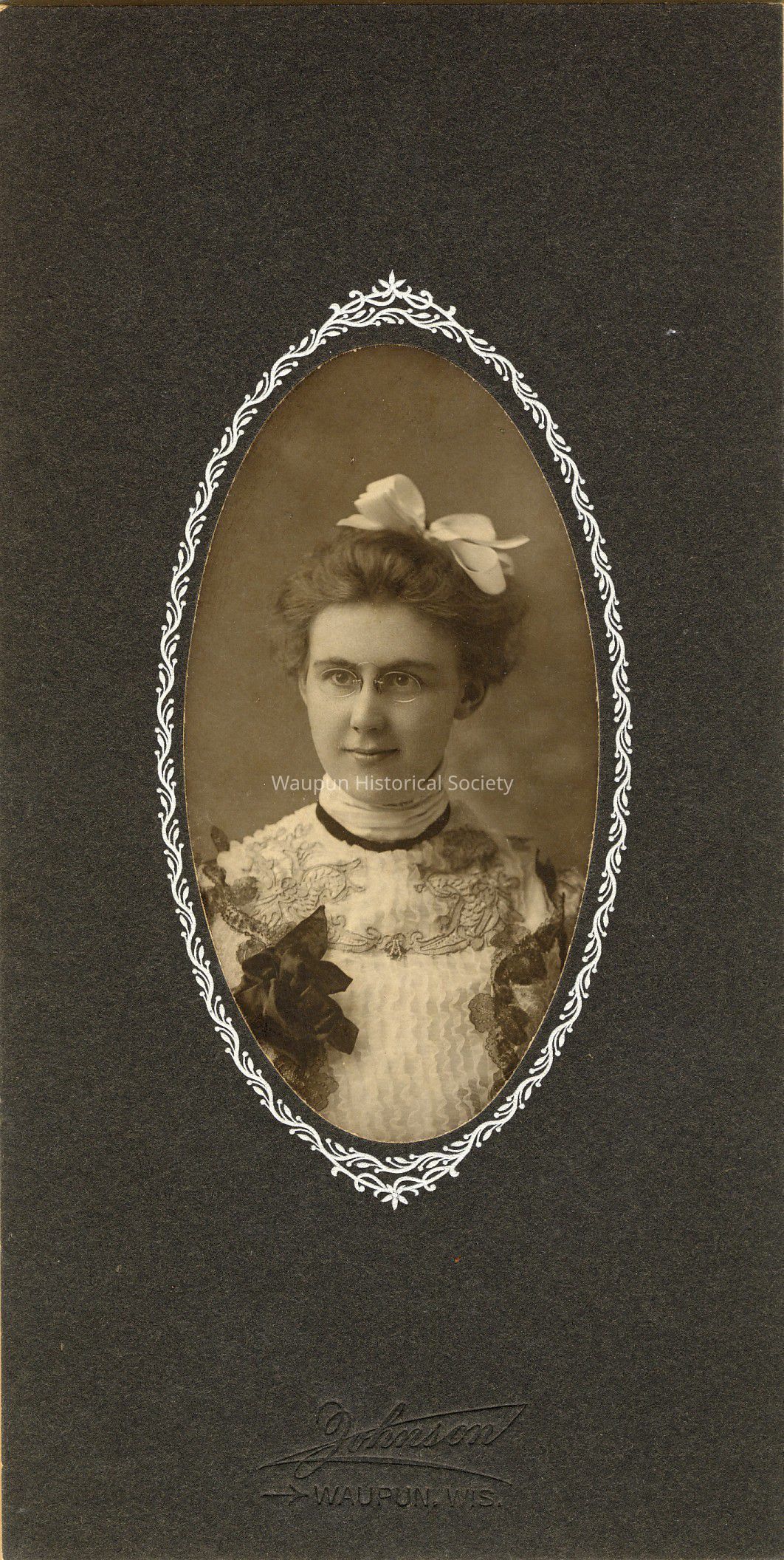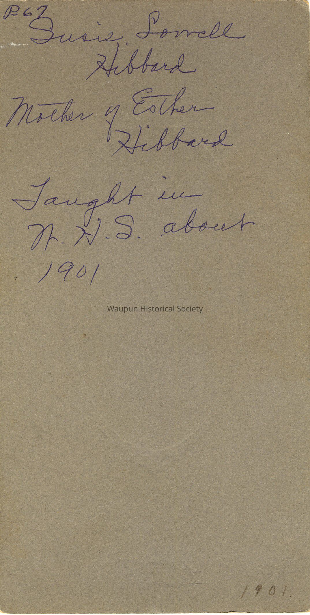 Portrait, Johnson, P. 67 from collection of Leona Nagler. We believe this to be Susie Lowell Hibbard, Mother of Esther Hibbard. As indicated on the back of photo Susie Hibbard taught in Waupun High School about 1901.Acquisition