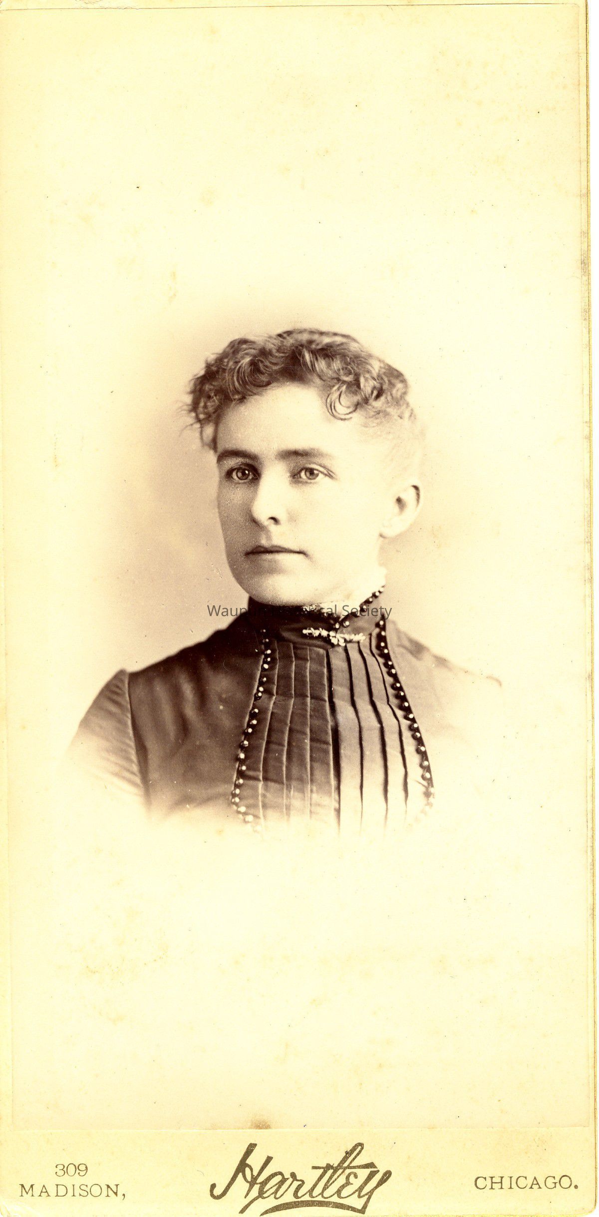 Portrait, P. 68 from collection of Leona Nagler. We believe this to be Margaret McFarlane who was a Primary teacher in the South Ward School during 1880's and 1890's, as indicated on back of photo.Acquisition