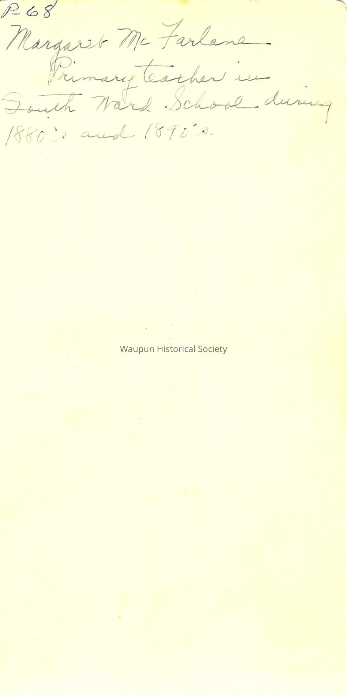 cabinet Portrait, P. 68, Margaret McFarlane, Teacher, South WardEntry/Object ID